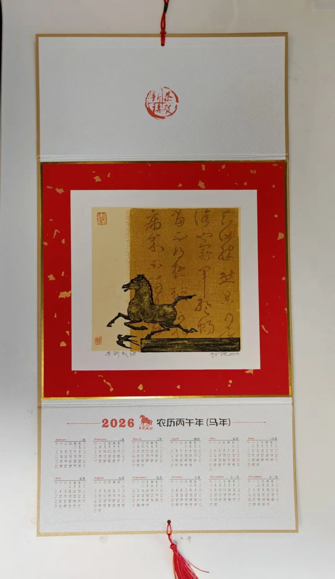 该作品采用传统油印工艺制作,通过五块底板套色印制而成。画面中,一匹骏马三足腾空,一足轻踏飞燕之背,造型动感凌厉,气势磅礴,生动诠释了“马踏飞燕”所蕴含的迅捷、勇毅与奋进精神。顾捷介绍,作品在设计稿与色彩选择上耗费月余,前后推敲数十稿,最终定下黄色的版本,极具古雅氛围。马匹采用黑色印制,再以金色复叠,增强层次感与金属质感,并运用柔纸法呈现马的纹理,形成铜铸般的立体效果,整体风格古朴厚重,别具韵味。背景则衬以奔放的草书,笔触经放大镜精勾细刻,与画面主体形成“软硬相衬”的独特艺术效果。