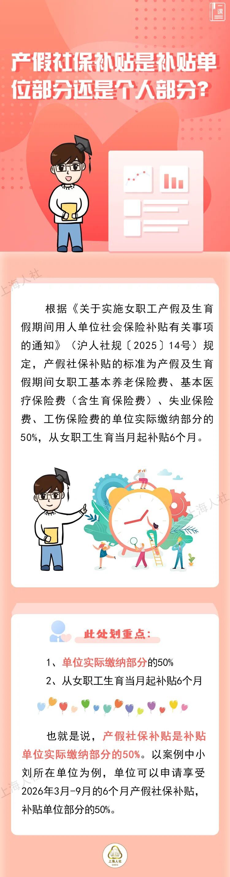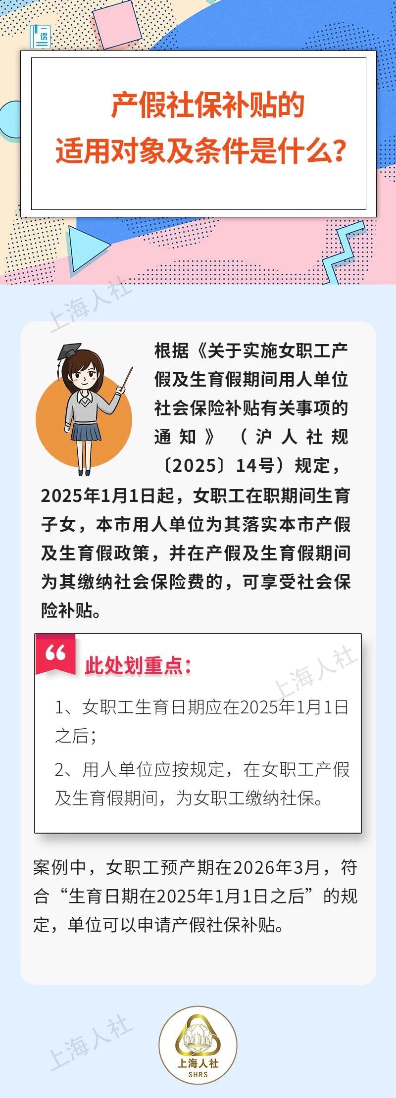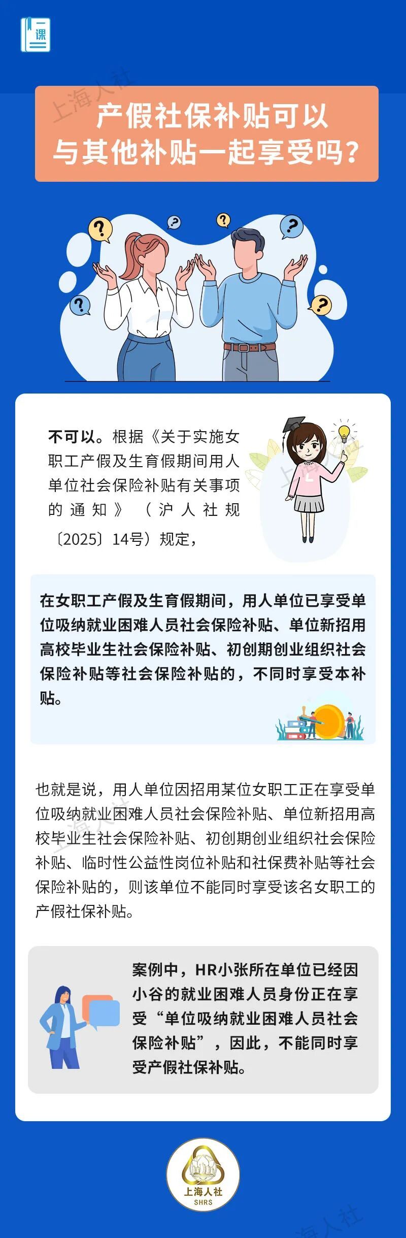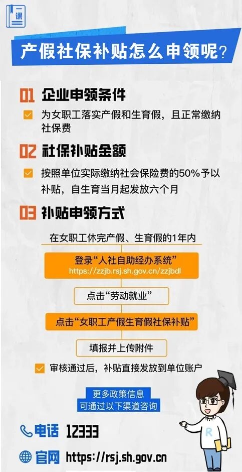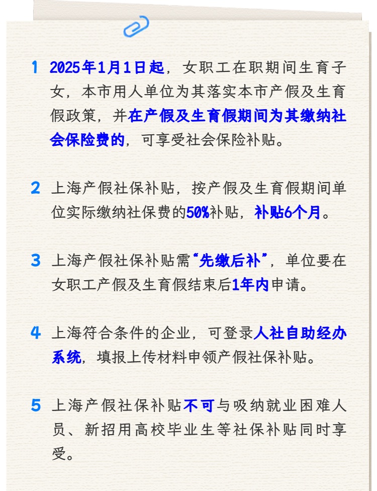 产假社保补贴的适用对象及条件是什么?产假社保补贴是补贴单位部分还是个人部分?申请产假社保补贴有没有时效?产假社保补贴怎么申领呢?产假社保补贴可以与其他补贴一起享受吗?关于这些问题,来看市人社局的回答↓ 点击“划重点”极速浏览↓↓↓ 小刘是本市一家科技公司的HR,从媒体上了解到上海推出了产假社保补贴政策,单位有一名女职工是今年3月的预产期,如果届时打算申请产假社保补贴,有什么具体条件吗? HR小刘所在单位有一名预计2026年3月生产的女职工,单位也因此可以申请产假社保补贴。职工社保由单位和个人共同缴纳。那这产假社保补贴是补贴单位缴纳部分,还是女职工个人缴纳部分,又或是都补呢? 在初步了解了上海产假社保补贴后,HR小刘梳理了一下目前公司女职工休产假的情况。除了这一名女职工预计今年3月开始休产假,还有一位女职工初步在8月开始休产假,要明年才能来上班。届时是否可以一起申请补贴?申请这个补贴有时效吗? HR小刘所在的公司今年有两位女职工要休产假。小刘在具体了解到产假社保补贴的适用对象、条件以及补贴时效后,还想知道,产假社保补贴怎么申领呢? 小张是一家广告公司的HR。前年公司招用了一名经认定的就业困难人员小谷。去年小谷怀孕,近日已顺利生产。了解到上海产假社保补贴的政策后,HR小张觉得,公司可以因小谷的情况,申请补贴。但去年单位已经在享受吸纳就业困难人员社会保险补贴……公司可以一起享受这两个补贴吗?