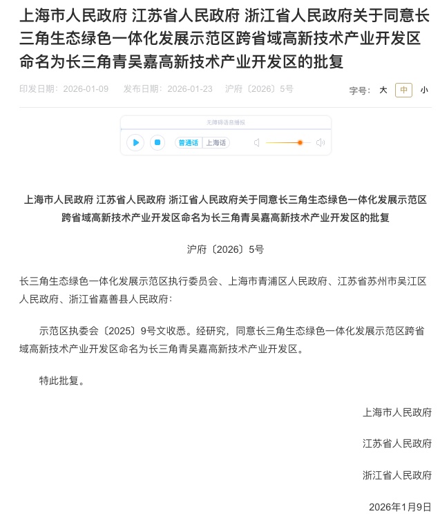 1月23日,上海市政府网站发布一则批复,上海市人民政府、江苏省人民政府、浙江省人民政府同意“长三角生态绿色一体化发展示范区跨省域高新技术产业开发区”命名为“长三角青吴嘉高新技术产业开发区”。