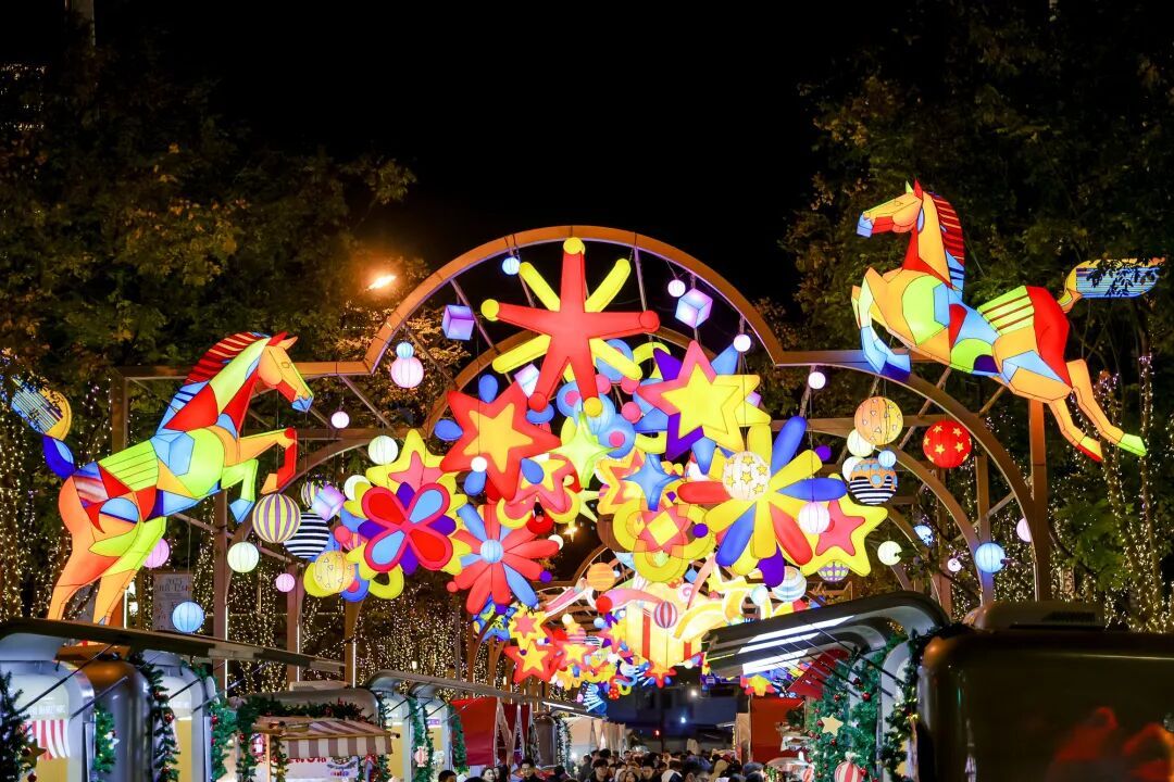 灯会打造“可看可玩可沉浸”体验。豫园中心广场每日“马力全开・亮灯仪式”以说书、鼓乐、群舞开启千灯齐明。“一马当先・节庆巡游”在大豫园流动上演,高跷木偶、NPC与“机器小马”穿梭其中,“天官赐福”“财神送宝”等场景带来互动惊喜。BFC南区“天马行空 外滩有戏”戏台构成“可走入的时空剧场”,B2“请回答・外滩 1990”复古街区复刻80—90年代场景与游戏,开运天马祈福坊提供投壶、套圈等体验。