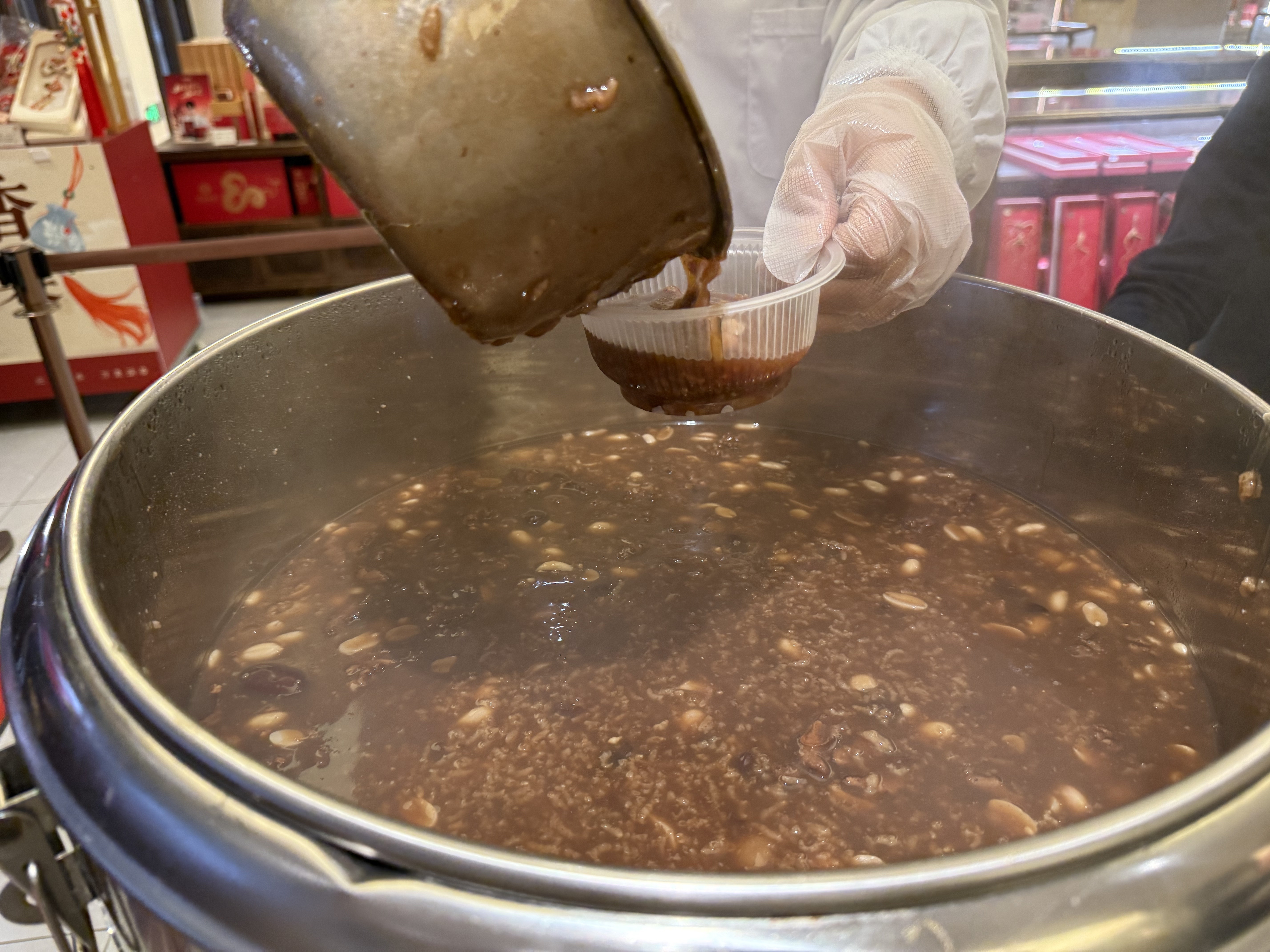 上午九点半,氤氲的热气裹着腊八粥醇厚的甜香,在豫园童涵春堂旗舰店门口悠悠散开。长长的队伍从店门蜿蜒开来,市民们有序步入店内,耳边响起工作人员一声声暖心的“腊八节快乐”。大铜锅里的腊八粥熬得软糯稠厚,咕嘟咕嘟地冒着热气,工作人员手持大勺,稳稳地为前来的市民盛起满满一碗,温热的粥香扑鼻而来。队伍里,有年年如约而至、坚守多年,捧着粥碗便想起儿时的腊八滋味的老上海人;也有不少慕名而来,想尝尝这碗藏着老上海味道的特色腊八粥的游客。