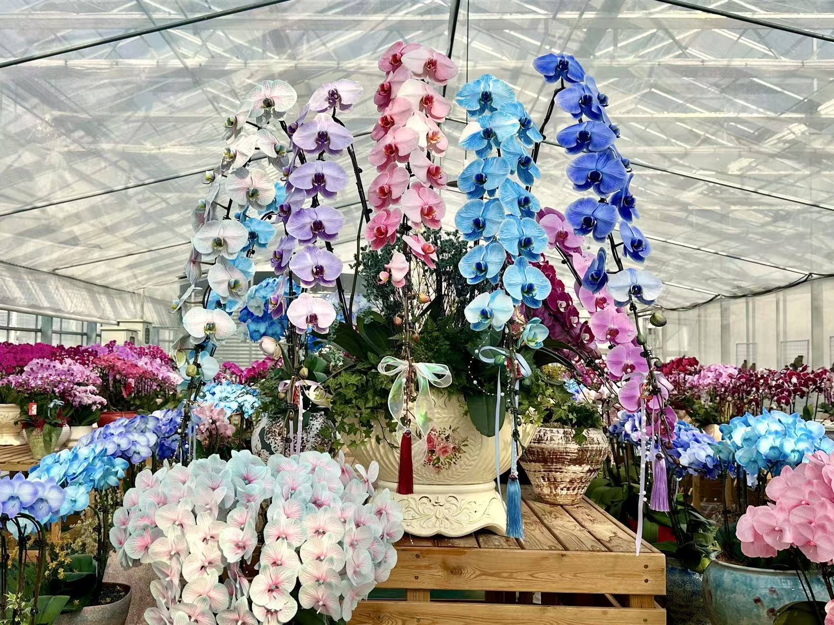 走进花卉大棚,暖意扑面而来。高山杜鹃、郁金香、仙客来等姹紫嫣红的年宵花竞相绽放,让人眼前一亮;金橘、佛手、北美冬青的枝头上,挂满了寓意吉祥的福卡,红红火火,格外喜庆。作为年宵花中的“顶流”,蝴蝶兰被商家摆放在最显眼的位置。今年除经典红色款外,不少花商还推出马卡龙渐变多色系、梦幻色系等时尚新品,精准契合年轻人的审美偏好。