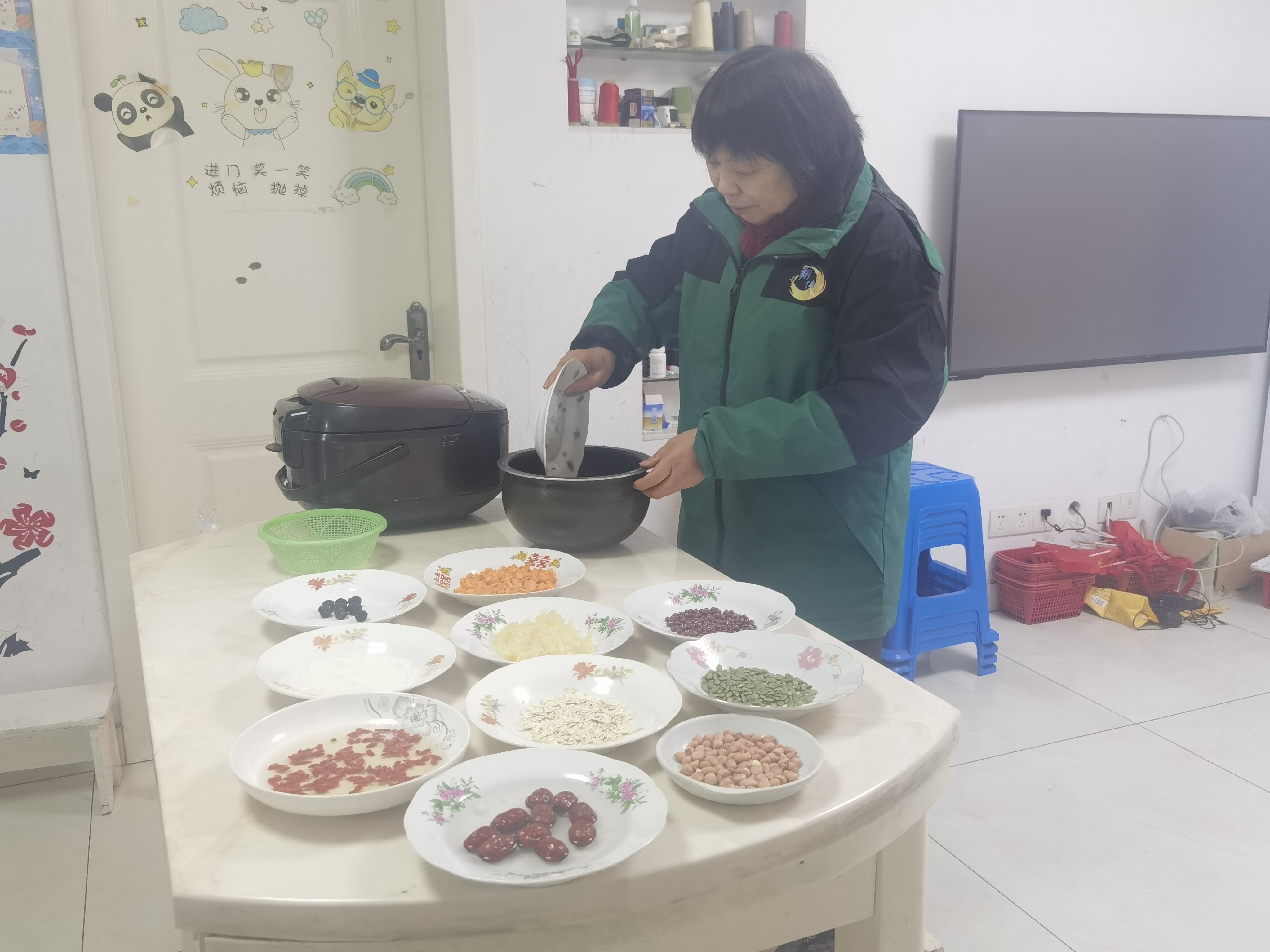 居民谢阿姨是社区睦邻点的东道主,她特意邀请许多邻居来家中分享这份腊八节的独特仪式感。为了制作腊八粥,早上8时谢阿姨就在忙活。