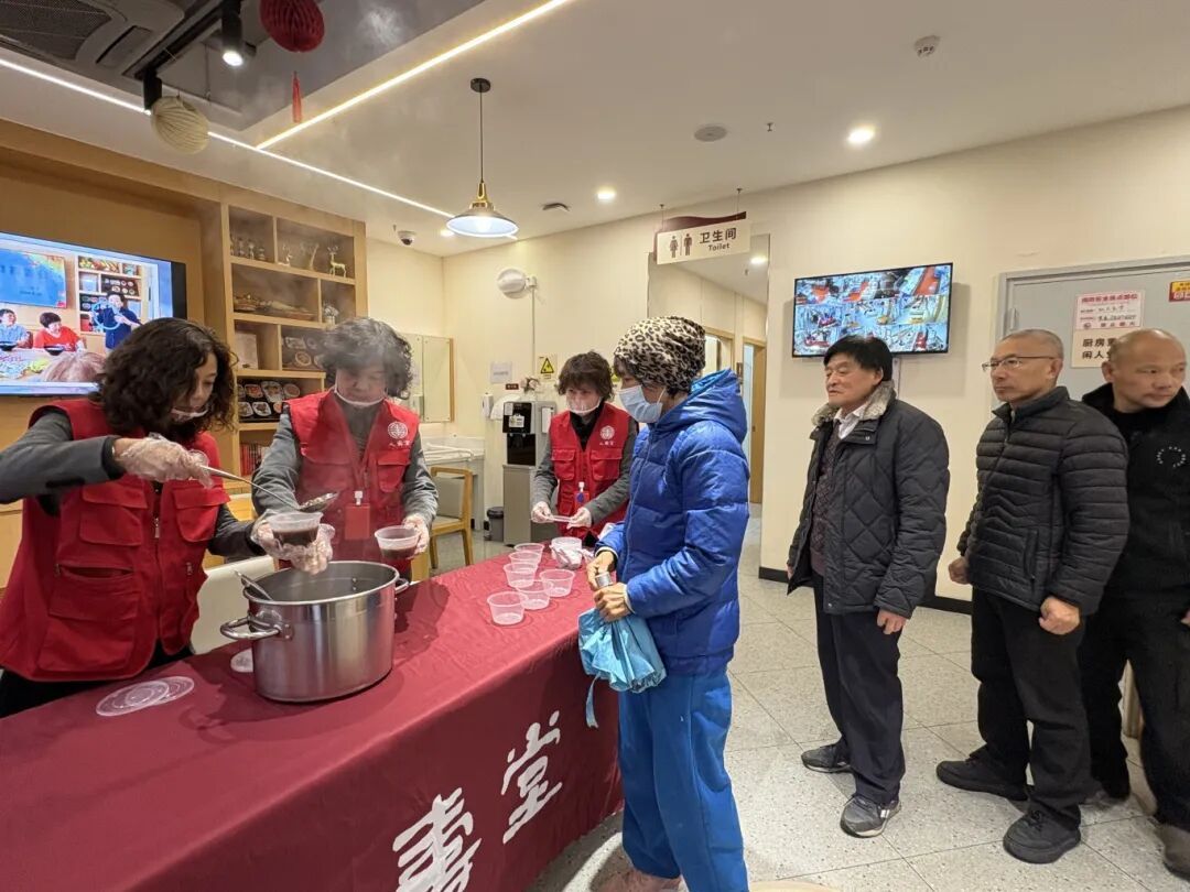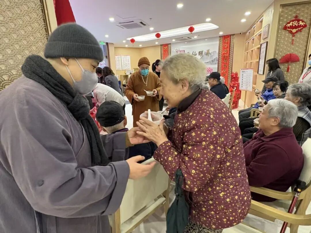 早上9点半,由下海庙派送的两大桶腊八粥冒着热气送到了虹口区逸仙虹福养老院,老人们坐在一起,一边聊天,一边品味腊八粥,感受腊八节传统节日气息。“过了腊八就是年啊,我们中国民俗传统都要吃腊八粥,吃了腊八粥以后就要过年了,开开心心、健健康康的。”