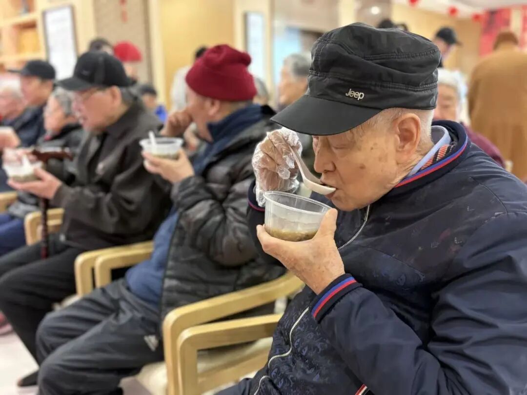 凉城社区长者食堂也熬制了香气四溢的腊八粥,送给周边的社区老人和新就业群体。顾阿姨是位独居老人,腊八节家里少了一点热闹,社区居委早早就通知老人们可以到社区食堂来一起过腊八节,和老姐妹们一起吃着腊八粥,老人感觉心里暖暖的。“因为是一个人居住的,腊八粥烧一点点呢,烧不好,就是没感觉,所以今天到这里来,热乎乎的这么多人一起吃,感觉很幸福。”