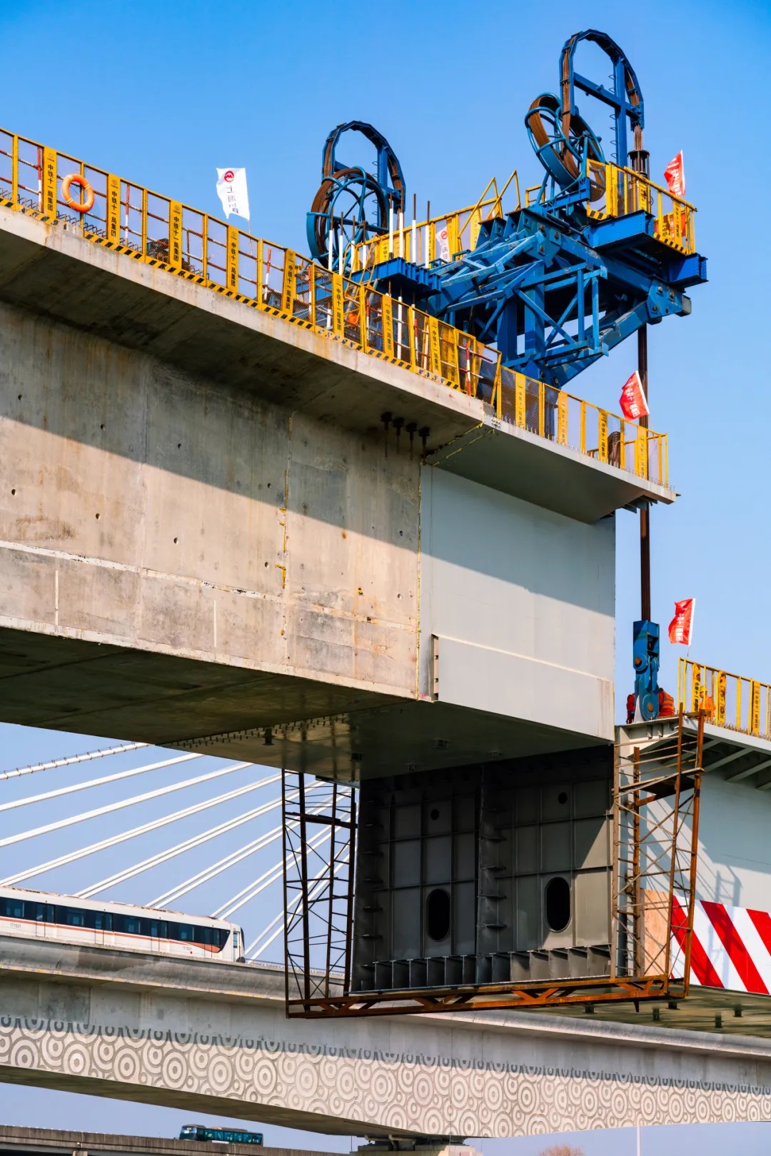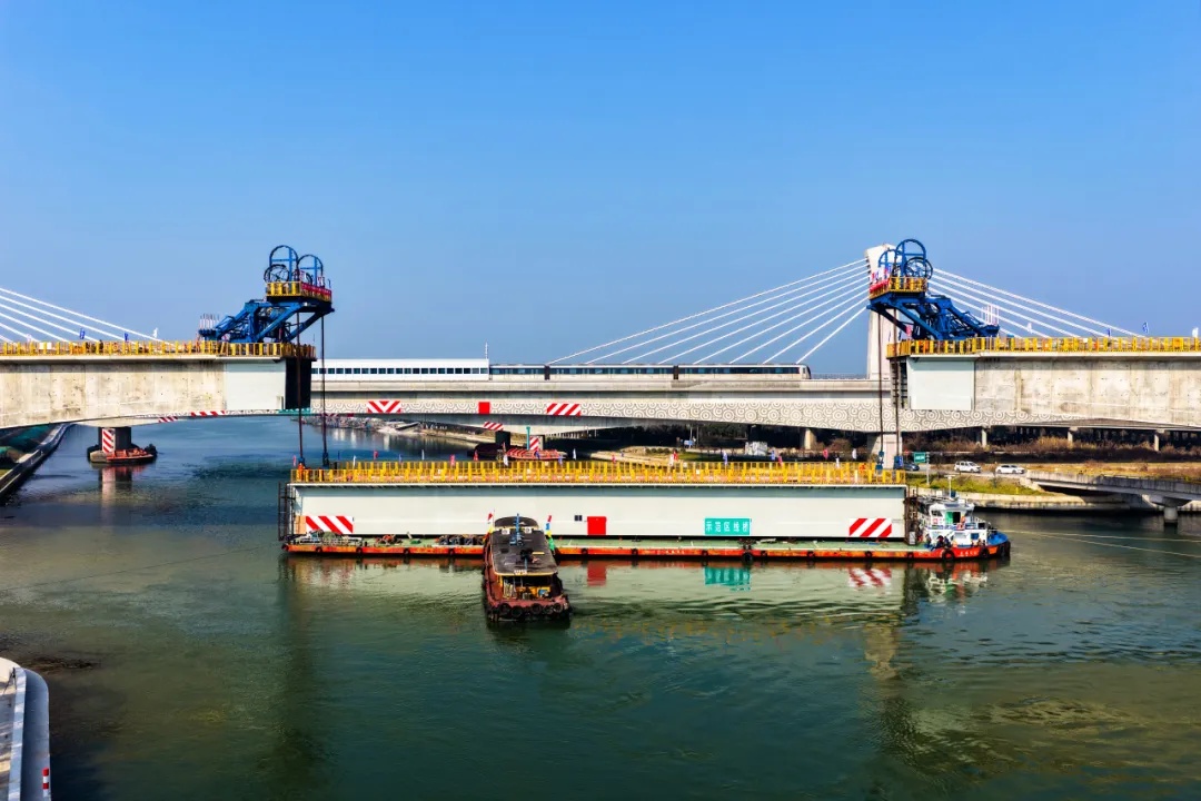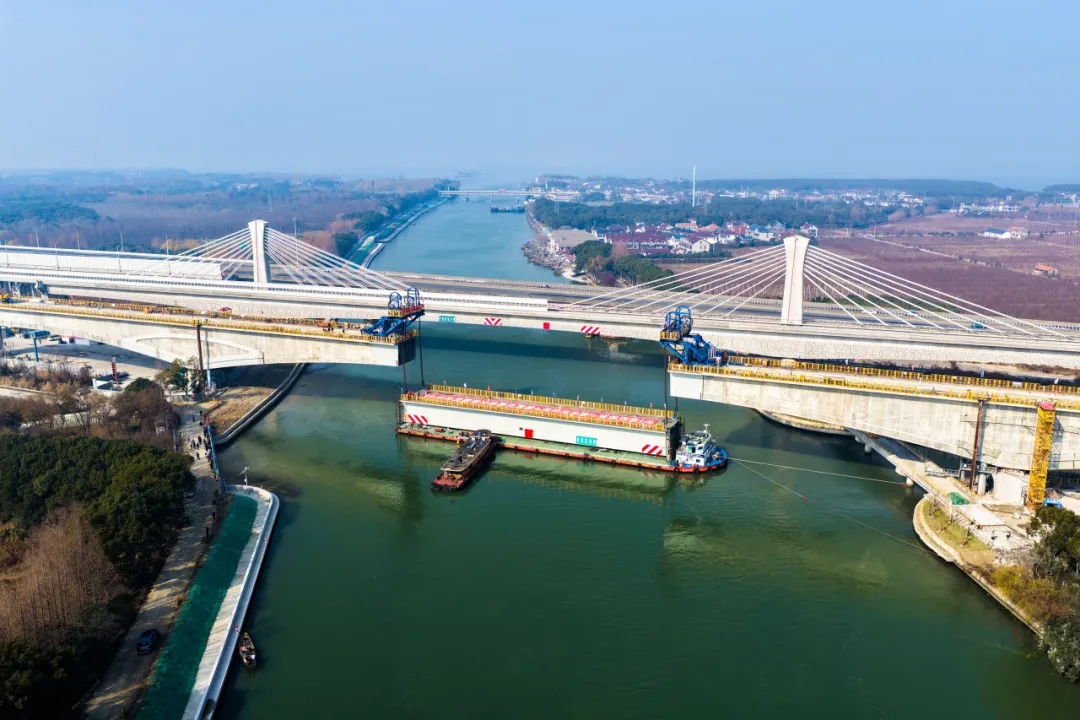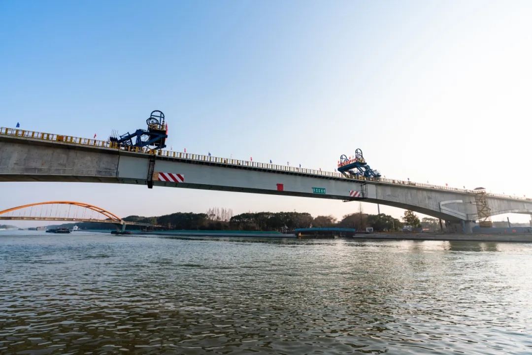 ▲ 上海示范区线跨拦路港桥 连续混合梁顺利合龙(时长:38秒) 近期,随着中跨钢箱梁顺利吊装就位,由上海申铁负责投资建设、中铁上海院设计、中铁十一局承建的上海示范区线4标跨拦路港桥连续混合梁顺利合龙,标志着工程主体结构建设取得重大突破。 4标跨拦路港桥位于青浦区,横跨二级水源保护区、三级航道拦路港,全长383.5米。主跨跨中68米采用钢箱梁结构,两侧各设7米钢混结合段,其余采用混凝土梁。 作为全线控制性工程之一,跨拦路港桥设计主跨为200米,为目前国内市域线最大跨度无砟轨道连续混合梁桥。 此次吊装的钢箱梁,长68米,宽11.5米,高5.85米,总重约878吨,采用整体吊装的新工艺,相较传统节段悬臂拼装方法大幅提升施工效率,有效降低了施工对航道通航的影响。 为确保精准合龙,项目团队与各参建单位联动协作,全过程精细化管控。钢箱梁制造前,通过多轮仿真分析修正预拱度;整体吊装方案经过多轮优化与专家论证。技术准备过程中,组织召开专题会议推演工艺细节。施工作业前,完成提升系统调试、吊装演练及应急预案编制。 施工过程中,运用液压同步提升技术,精准控制四个吊点同步作业,确保提升误差小于2毫米;持续48小时高频观测结合段温度及变形数据,动态指导配切作业,最终将合龙误差控制在5毫米内,实现“零误差”精准对接。 上海示范区线全长52.4公里,途经闵行、青浦2个行政区,全线共设10座车站,列车最高运行时速160公里。项目建成后,将构建起连接上海主城区、青浦新城与嘉善、吴江等地的快速交通骨架。作为沪苏嘉城际铁路上海段,上海示范区线不仅是长三角生态绿色一体化发展示范区的门户线路,也是上海市域线网的重要组成部分。