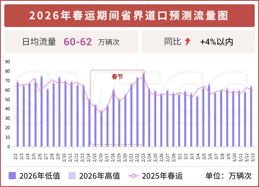 随着探亲流、学生流、务工流、旅游流多重叠加,2026年春运期间出行需求持续增长,高速公路流量呈上升趋势。预计2026年春运期间高速公路日均流量132—137万辆次,同比增长3%—6%。