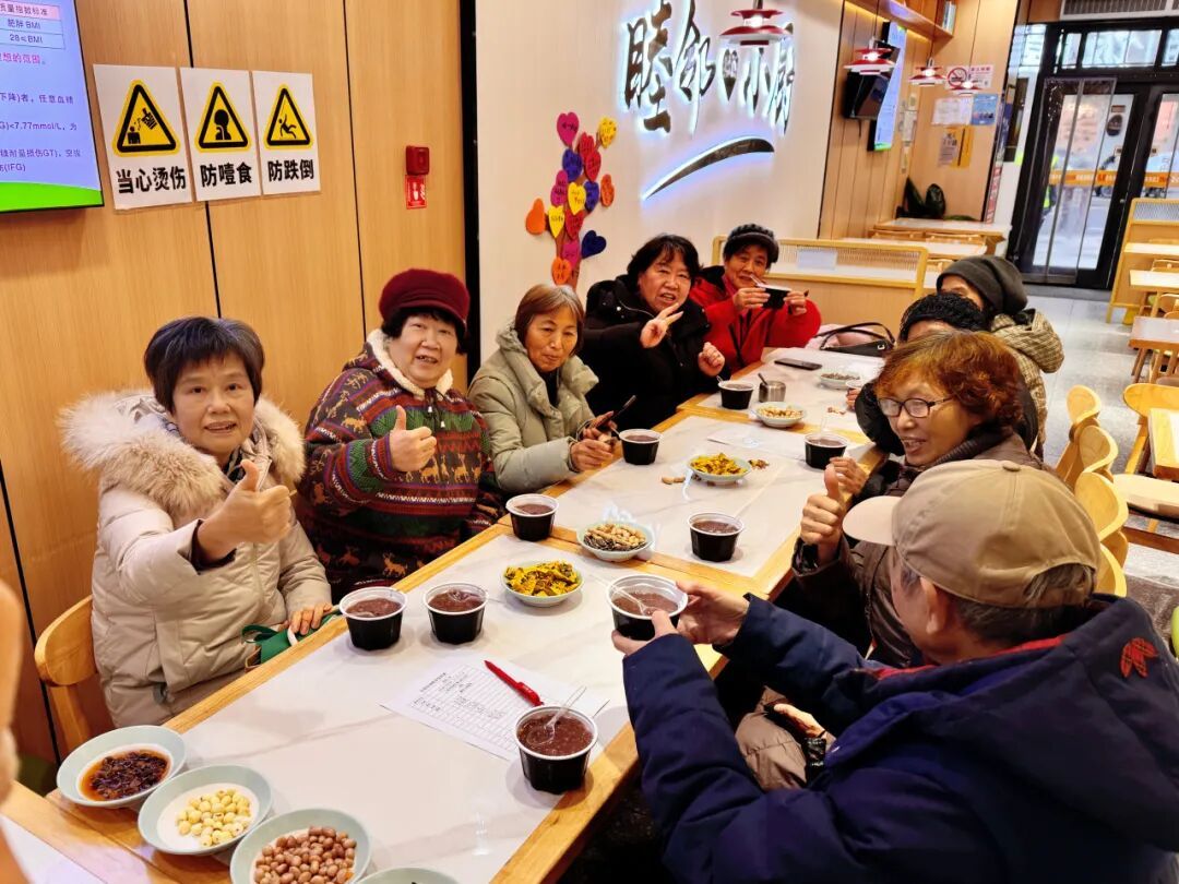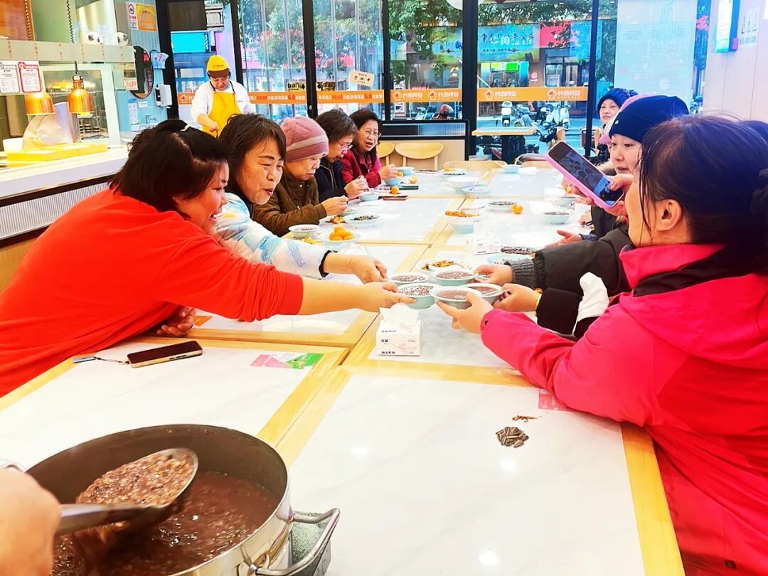三大互动环节还让食堂充满“文化味”。“食材识趣”环节,厨师逐一介绍腊八粥八种食材的寓意,老人们围在一起辨认、讨论,不时分享自家熬粥的诀窍;“典故小讲”环节,志愿者对腊八节的起源与习俗娓娓道来;“福粥打卡”处更是热闹,老人们捧着粥碗与同伴合影,脸上绽放出灿烂笑容。