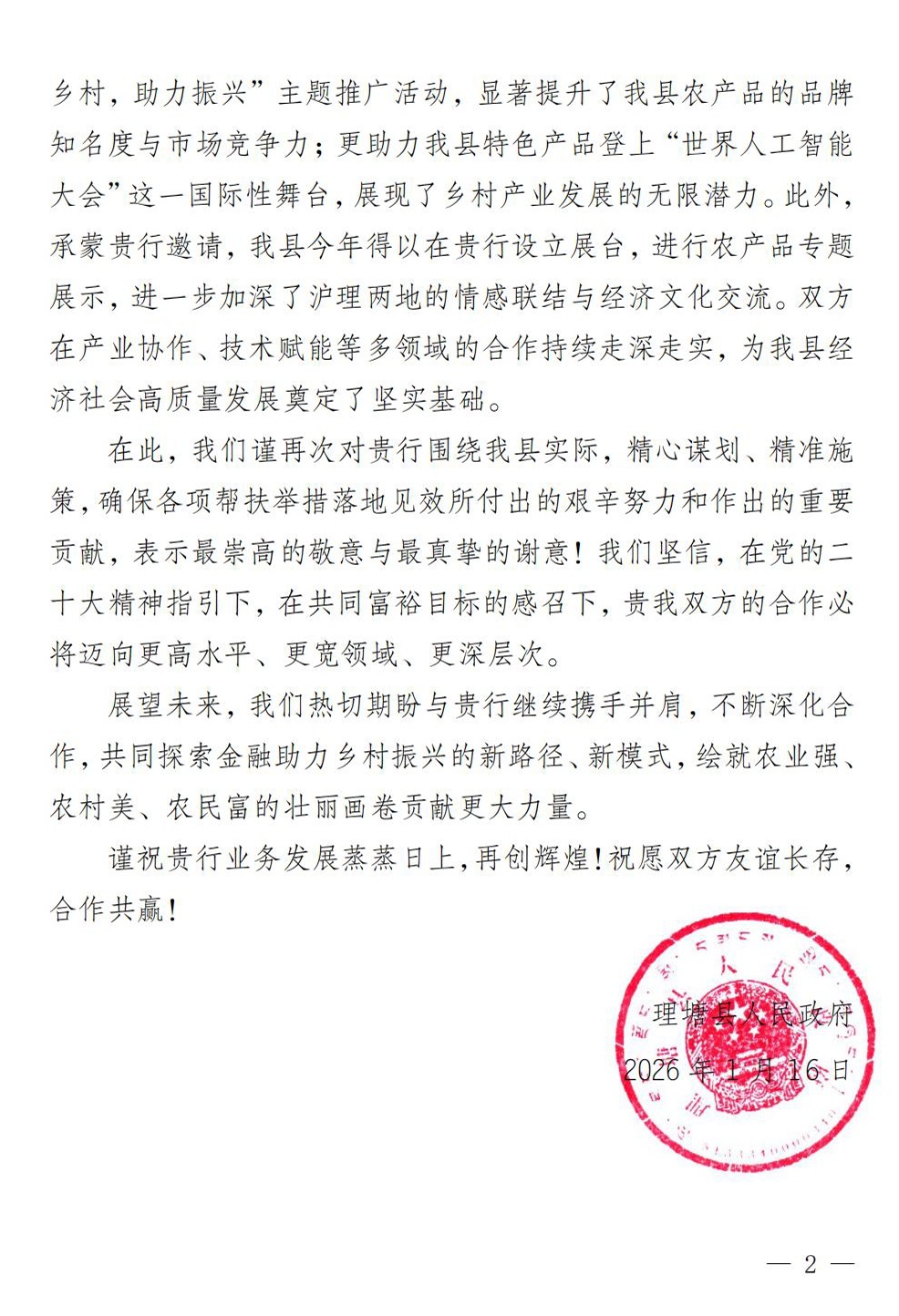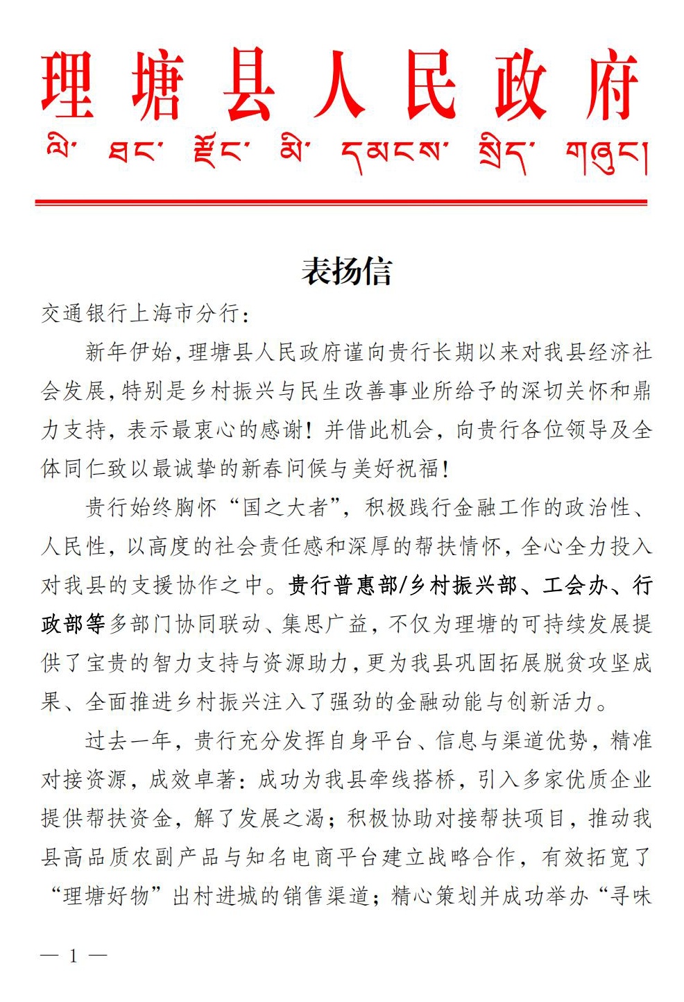 近日,交通银行上海市分行收到四川省理塘县人民政府发来的表扬信。信中,理塘县人民政府高度赞誉分行的社会责任感与深厚的帮扶情怀,并对分行长期以来给予的倾力帮扶表达诚挚感谢。