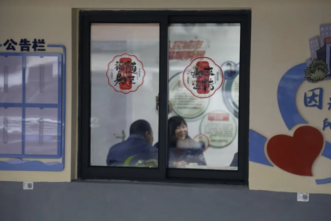 走进德园路道班房,改造后的空间虽不大,却敞亮整洁。靠墙一侧,冰箱、微波炉、电热水壶、应急医药箱等设施一应俱全,桌椅摆放得井然有序。临近新春,环卫工人亲手贴上的春联和窗花,更让这里充满温馨。