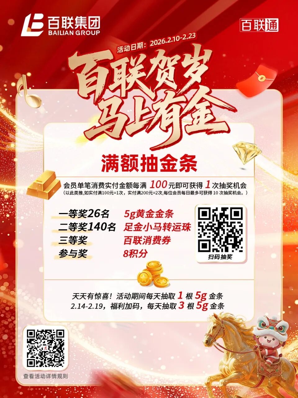 新春的期待,始于未知的惊喜。百联集团精心打造“百联贺岁,马上有‘金’”百联通会员专属活动,为消费者送上新春好彩头。2月10日至23日活动期间,百联通会员单笔消费每满100元即可获一次抽奖机会,每日最高可享10次抽奖机会,真正实现“多买多抽,好运翻倍”。奖池“含金量”十足:26根5g黄金金条、140份足金小马转运珠以及百联集团旗下各业态消费券、百联通会员8积分礼等多重会员好礼。活动期间每日送出1根5g金条,2月14日至19日惊喜加码,每日送出3根5g金条,承包2026年的开篇“金”喜。