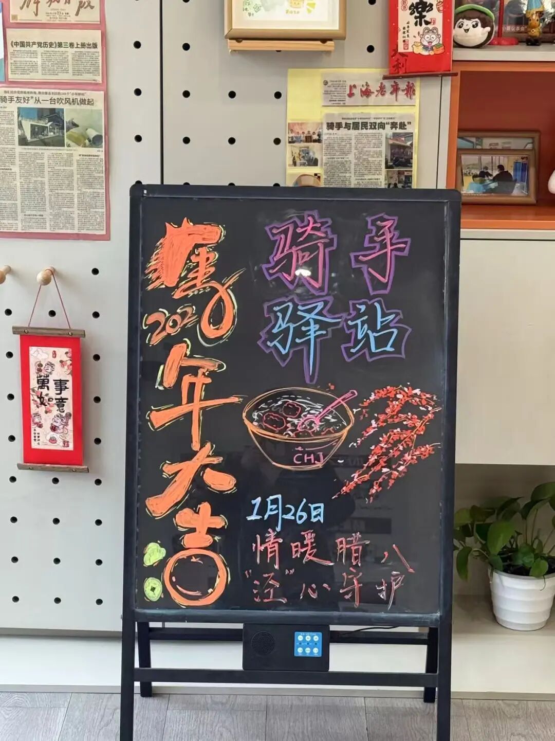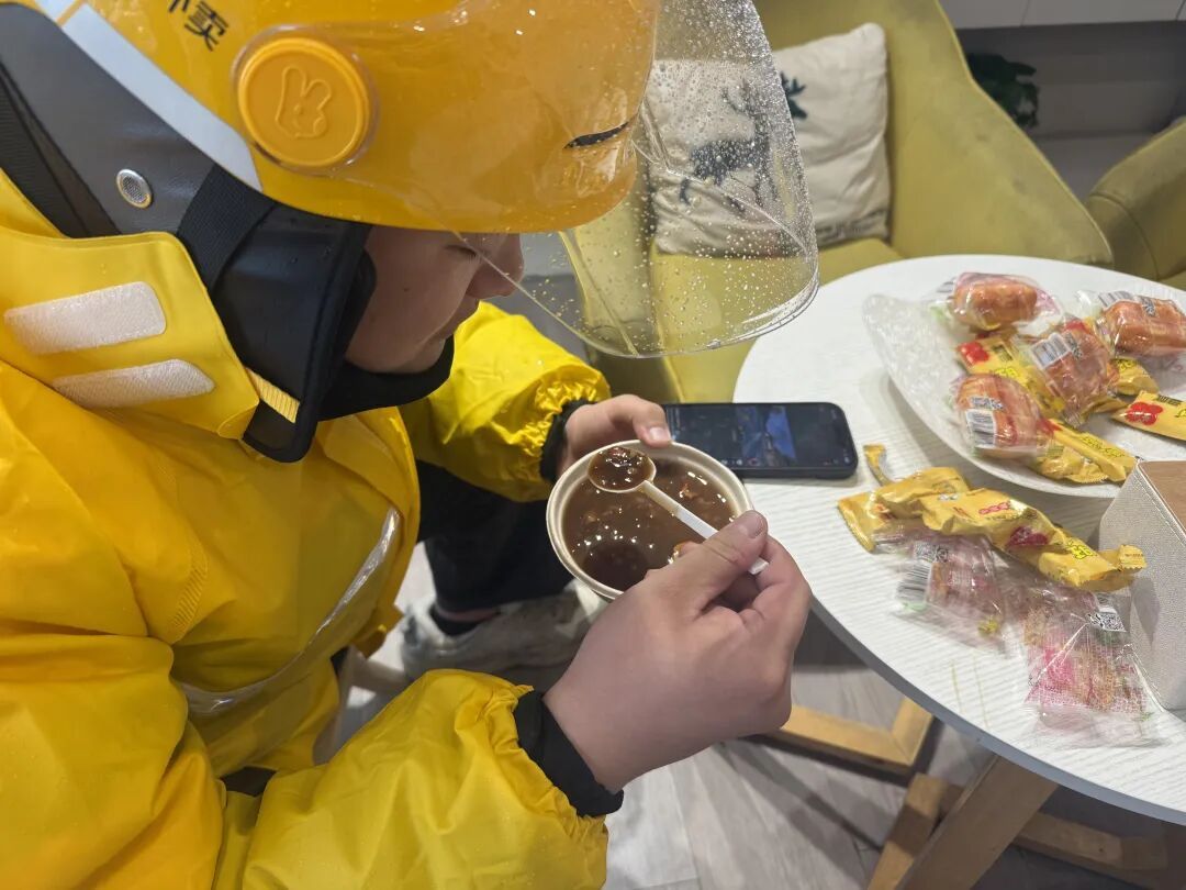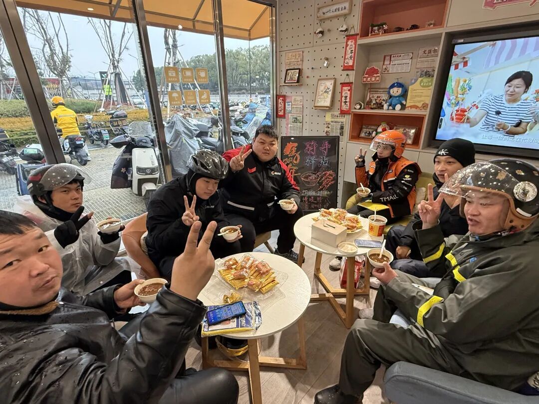 赶在休息时间,外卖小哥们进驿站喝腊八粥