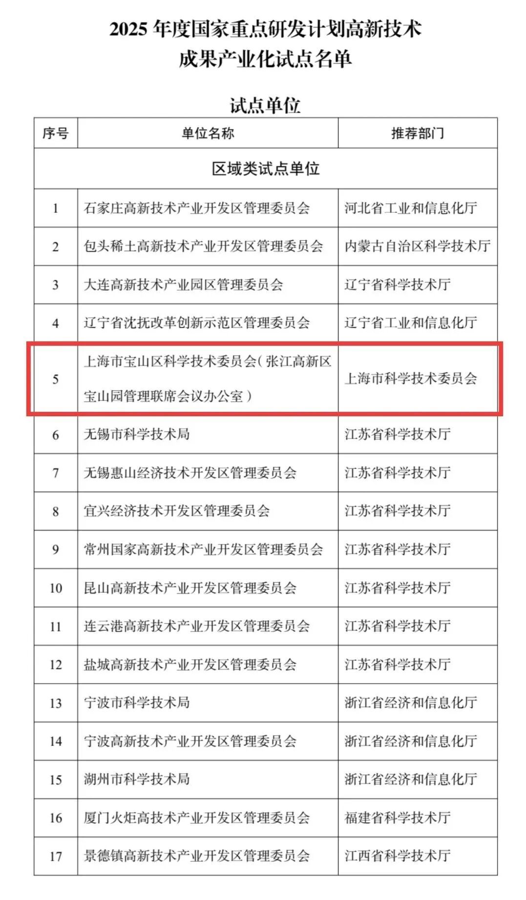 近日,工业和信息化部办公厅印发《关于公布2025年度国家重点研发计划高新技术成果产业化试点名单的通知》(工信厅高新函﹝2026﹞28号),上海市宝山区科学技术委员会(张江高新区宝山园管理联席会议办公室)成功入选区域类试点单位,标志着张江高新区宝山园在推动高新技术成果产业化、培育新质生产力方面获得国家层面认可,正式跻身国家级试点行列。