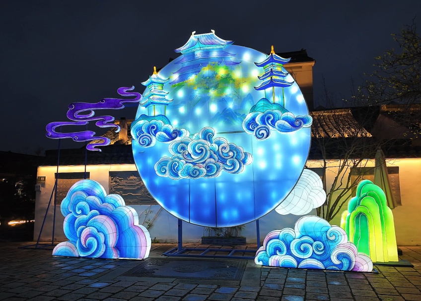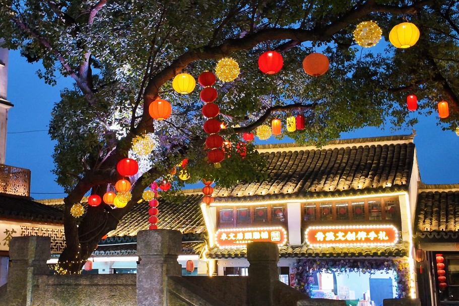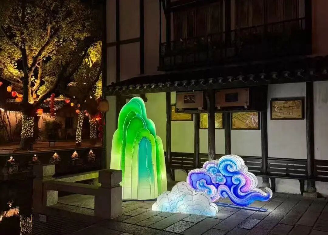 灵动的骏马灯与茶馆窗棂透出的暖光,和着水廊灯影交融在一起,构成鲜活生动的江南烟火。