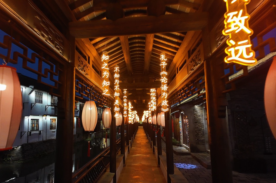 临水长廊里,一串串暖黄灯光垂悬而下,跨越千年的古老智慧,化作光的笔画,垂落为温润的光河。借着夜色漫步其中,就仿佛走入一幅活着的字卷。