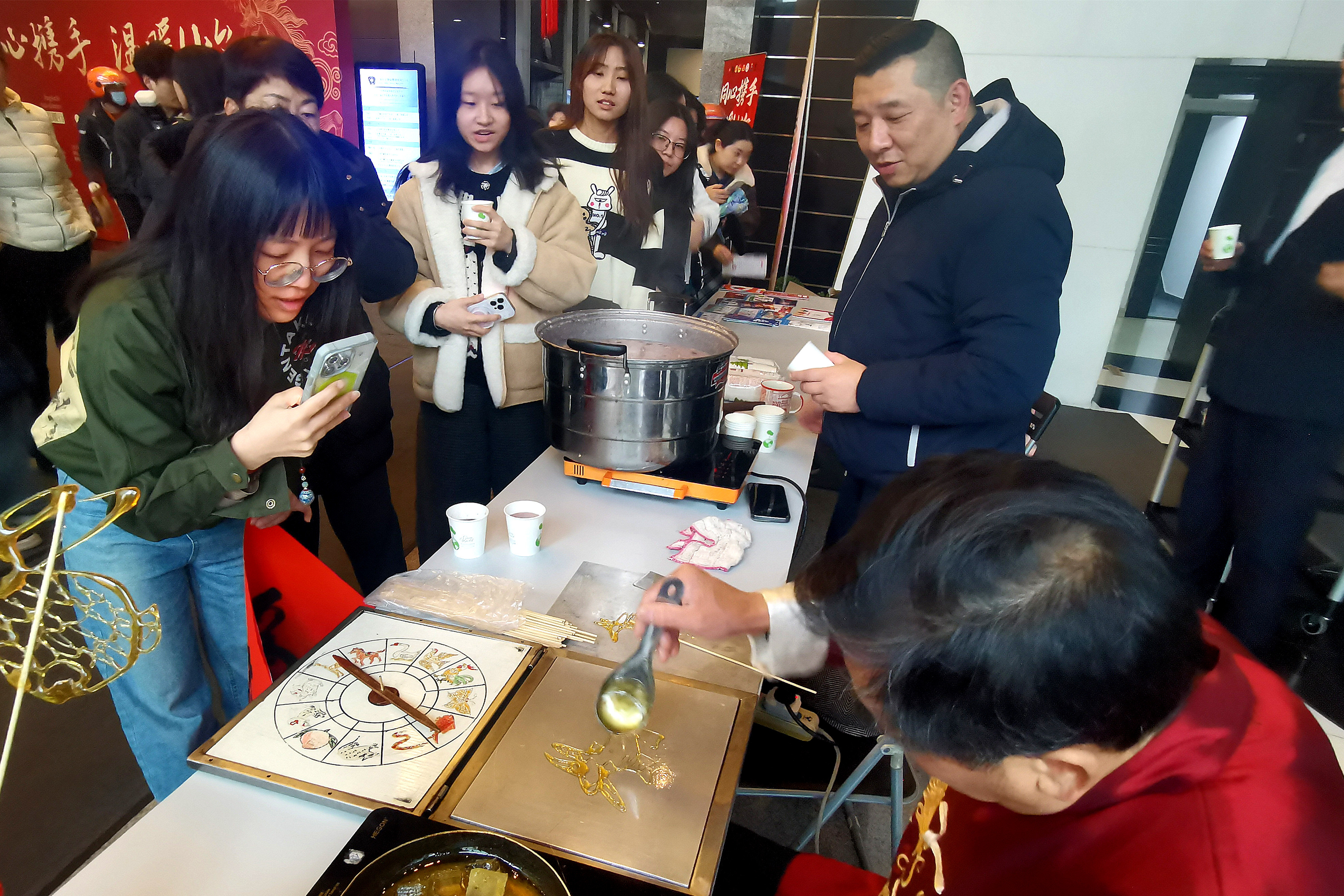 一双巧手,一勺糖浆,凝结的是甜蜜的祝福。在糖画体验区,糖画师傅手持铜勺,以融化的糖液为“墨”,顷刻间就把一匹萌趣可爱的小马勾勒出来。不少白领还现场“点单”,请师傅当场制作糖画生肖,“我属马,想要一匹长着翅膀的飞马。”“我喜欢机灵的金猴。”大家在欢声笑语中认真欣赏糖画制作这门传统民间技艺,感受浓浓的新春年味。
