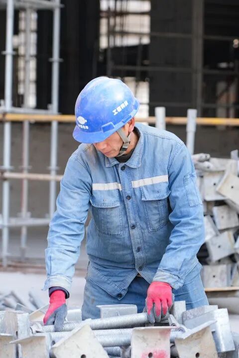 在封顶现场,8层钢框架结构的综合楼已初具雏形。现场工人们正有序对楼顶拆卸的支模钢管进行打包整理,等待统一清运。各类施工机械有条不紊地运转,有序施工。