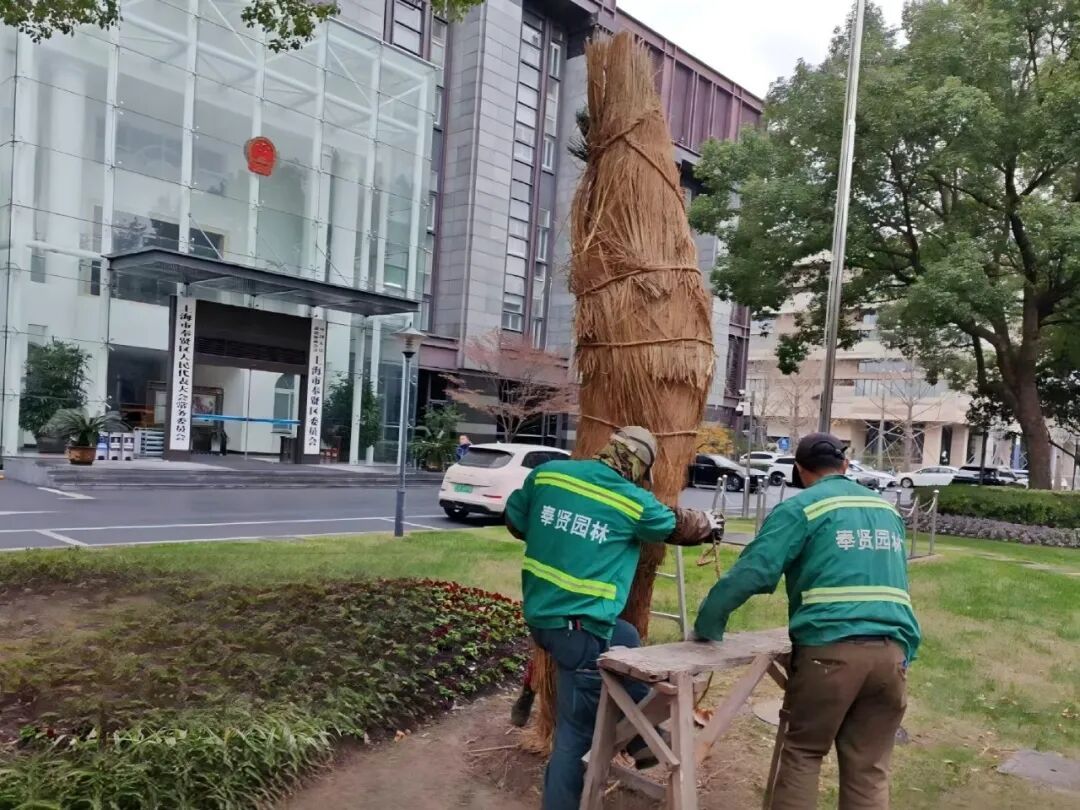 随着大雪节气的到来,气温逐渐降低。为了应对严寒天气,确保城市绿地中的树木安全过冬,近日,随着气温持续走低,为确保城区树木安全过冬,奉发园林提前启动冬季树木保温养护工作,为公园绿地、主要道路中不耐寒的植物穿上“保暖衣”。