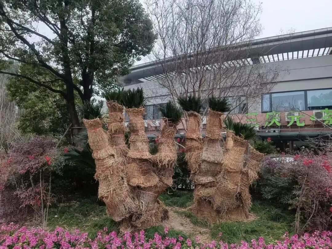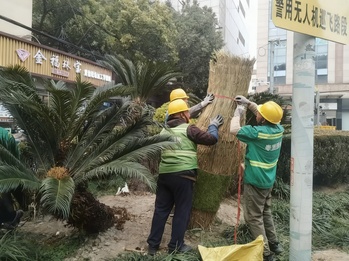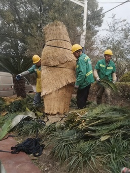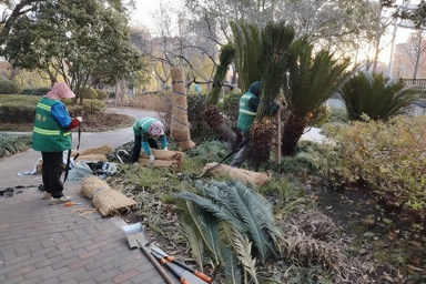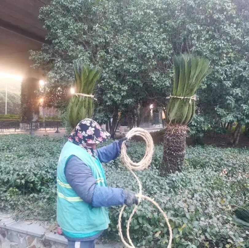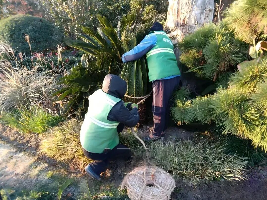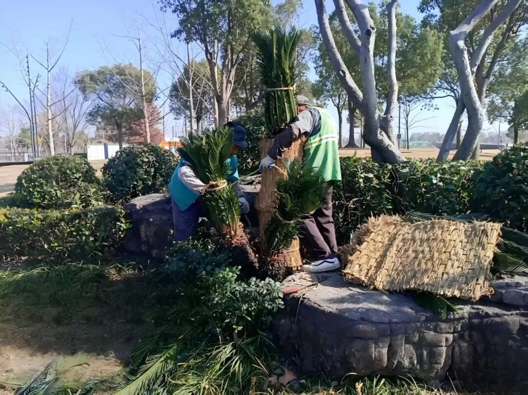 针对铁树等低温耐受力较差的植物,绿化养护人员采用草毡包裹树干,再捆上麻绳,为它们穿上一层厚厚的“冬衣”进行防寒保暖。