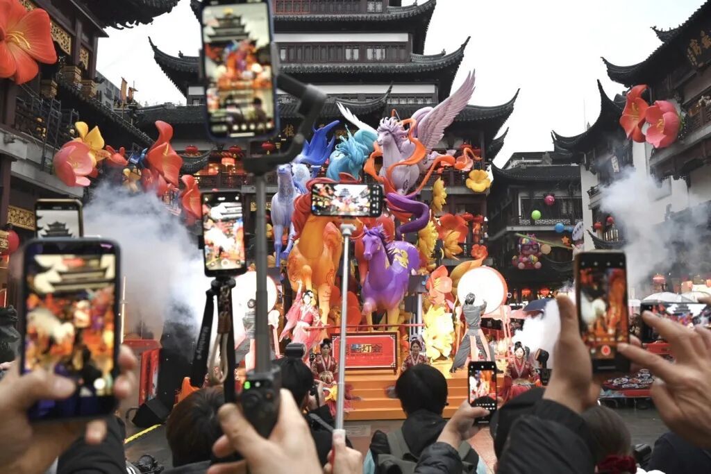 灯会突破传统观灯模式,构建起“可看可玩可沉浸”的节庆生态。每日傍晚,豫园中心广场的“马力全开·亮灯仪式”以说书人独舞、激昂鼓乐拉开序幕,千灯齐明瞬间点燃氛围;“一马当先·节庆巡游”中,非遗高跷木偶、机器小马与“天官赐福”“财神送宝”等主题场景流动上演,游客可随时加入收获惊喜;“以梦为马·定点演艺”带来江南舞韵、戏腔雅乐、皮影戏等精彩节目,福禄童子NPC穿行灯区送福,让年味触手可及。
