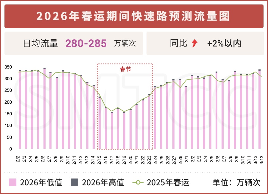 春运后期:受中小学开学影响,节后短期返程车流将依然维持在相对高位,春运后期流量呈现波动变化,正月十五后路网将逐步恢复常态运行水平。预计高速公路日均车流规模达135-140万辆次,同比增长5%以内。
