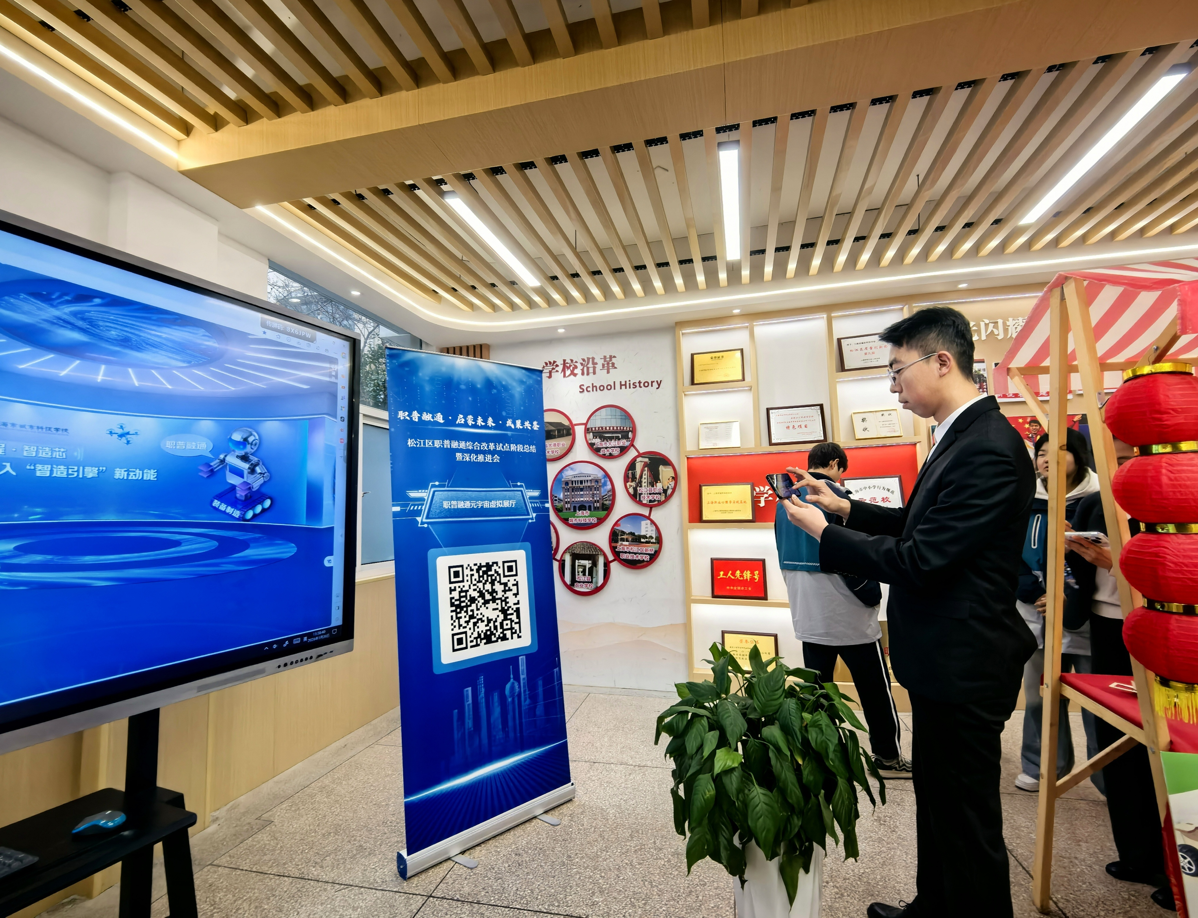 当天,会场外设置了学生成果展示区。除齿轮模型、太阳能汽车模型等手工作品外,职普融通元宇宙虚拟展厅格外引人注目。上海市城市科技学校党委书记、校长陈雷介绍,下阶段将推动职普融通从“局部试点”向“集成发展”迈进,通过完善“松江区职普融通课程数字资源平台”,整合优化课程资源,借助人工智能技术开发数字化内容,实现中小学一键式选课、个性化推荐,促进资源共建共享。