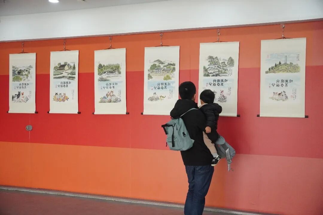 步入展厅,“建党百年”系列作品率先映入眼帘。一幅幅画作将庄重的红色建筑与灵动的猫咪形象巧妙融合,令人眼前一亮:延安宝塔山下,三只猫咪仰首瞻仰;平型关大捷纪念碑前,“喵星人”欢欣依偎,仿佛共享胜利喜悦;泸定桥畔,猫咪凝望铁索与波涛,神态肃穆。观众们驻足细品,家长们借此追忆往昔,孩子们则围着画中的猫咪兴奋讨论。“这些作品既让孩子接触了红色历史,又通过猫咪形象显得特别亲切,构思真好。”一位带孩子观展的家长称赞道。