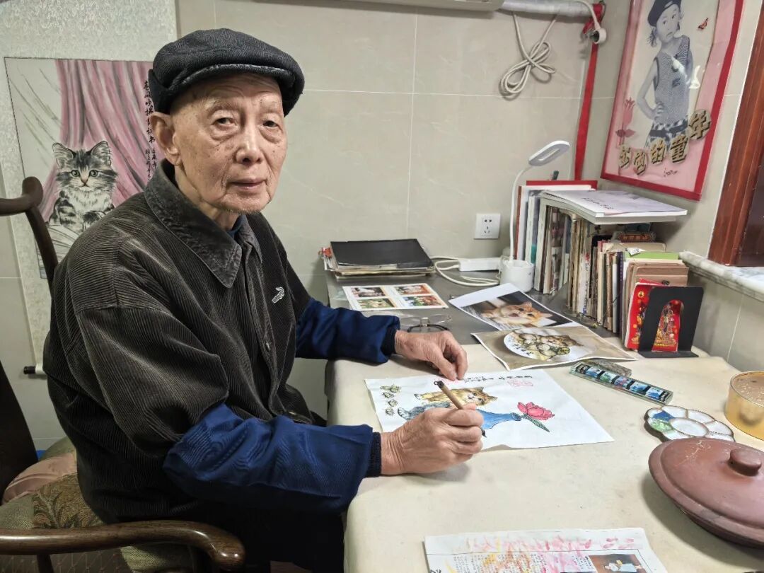 “茸城猫王”的美誉,源于金梅良二十载画猫的执着坚守。当年,小孙女一句“爷爷给我画只猫吧”,让他许下“画百猫”的诺言。自此,他不仅在家中养猫,更每日外出观察、投喂流浪猫,至今笔下的猫咪已逾千只,个个栩栩如生。此前,“猫眼看松江”系列让萌猫漫步松江名胜,广受市民喜爱;如今他又精心创作“建党百年”系列,以独特视角礼赞红色历史,令“猫王”之名愈发响亮。