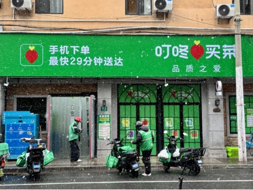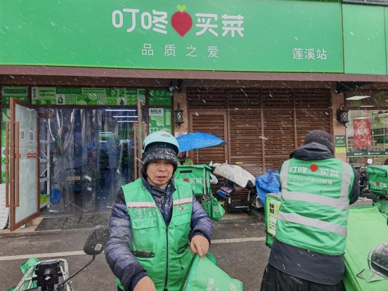 降温、雨雪天气,早晚或有路面结冰的情况,骑手们的配送难度和单均时长会有所增加。为及时履约,叮咚买菜也通过优化排班、第三方招募等方式,增加特殊天气下的在岗人员,全力保障周边居民拎稳菜篮子。