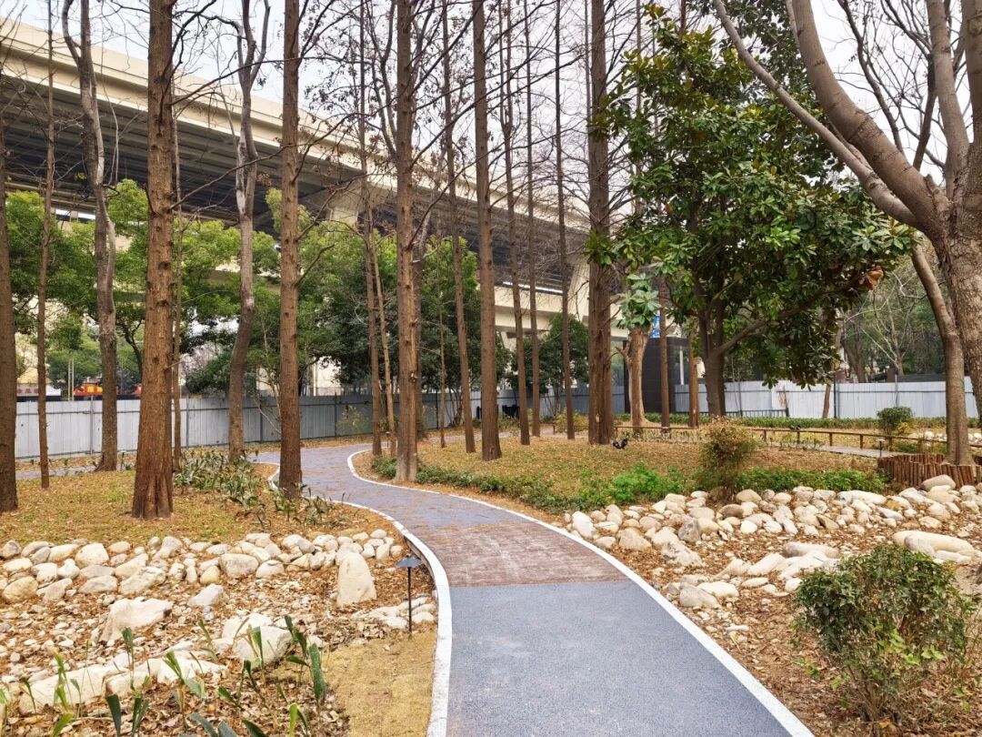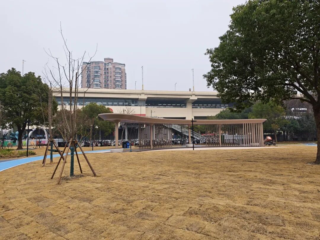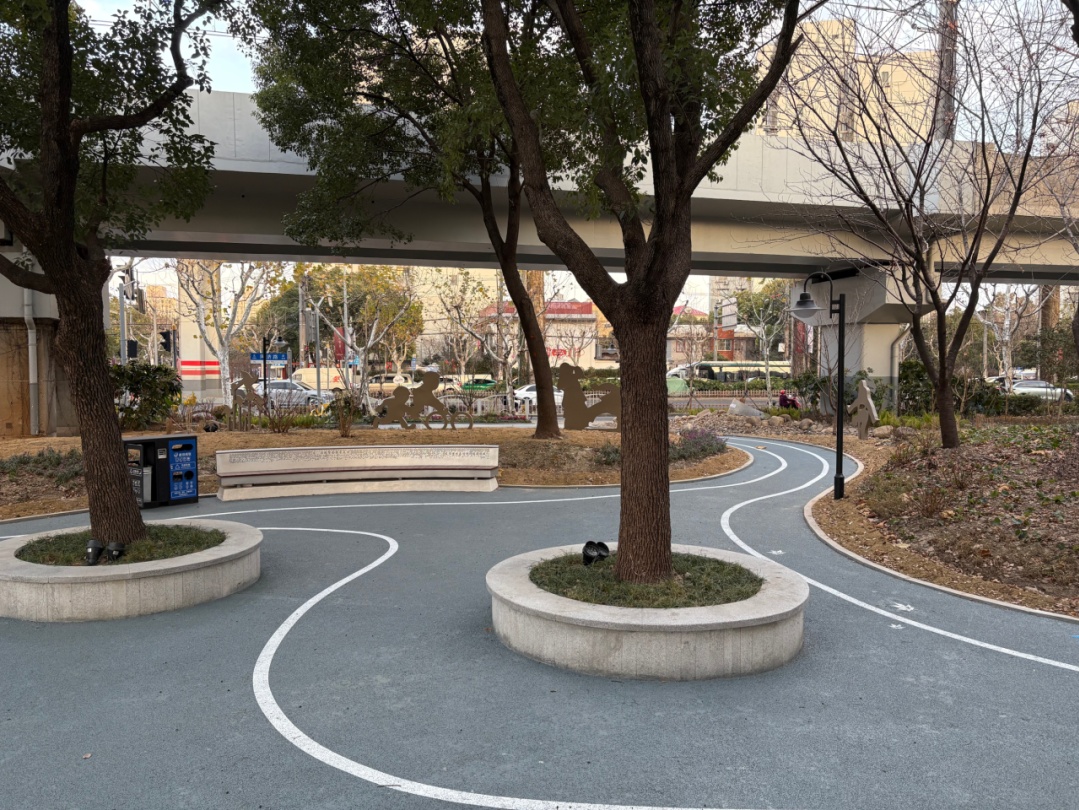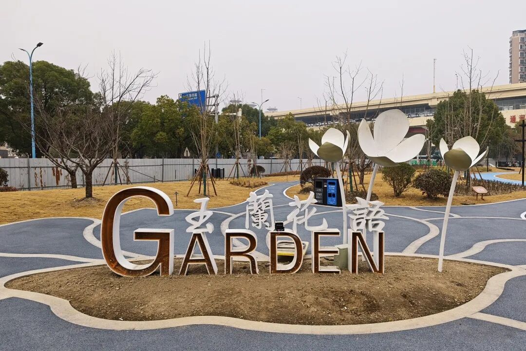 位于共和新路与长江西路交会处的“玉兰花语园”口袋公园以上海市花“白玉兰”为主题,不仅是一处可供休憩的绿地,更是一座融文化、休闲、社交于一体的“城市绿色客厅”。在这里,忙碌的都市节奏可稍作停歇,自然与城市生活得以温柔衔接。 玉兰精神,融入每一处景观。公园以白玉兰“开拓、向上、高贵、坚韧、博爱”的精神品格为脉络,借助玉兰花团等中国传统经典纹样,通过景观雕塑、地面彩绘、入口标识、艺术廊架、主题植物等形式具象呈现,将玉兰之美与上海城市气质相融合。 在功能布局上,公园充分考虑全龄段市民的需求,打造了多元复合的活动场景。 城市客厅:阳光草坪与景观廊架,适合休闲聚集 林下雨水花园:生态与美观兼具 艺术打卡点:适合拍照、休憩 公园保留了原有长势良好的香樟、水杉等乔木,新增白玉兰主题树种,并搭配四季常绿、耐阴观赏的草花与地被植物,打造层次丰富、季相分明的植物景观。虽然目前时值冬季,草木尚未繁花似锦,但园内绿植已基本栽种完成,静待花期来临后渐次绽放其完整的景观效果。 公园重新梳理人行与车行流线,优化非机动车停放,提升铺装与照明,让公园与周边地铁、商业、居住区无缝衔接,停车空间更为规整,绿色出行更安全便捷。