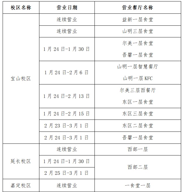 4.2月27日,除宝山校区水秀二层食堂外其他食堂恢复营业,3月2日三校区所有食堂恢复营业;