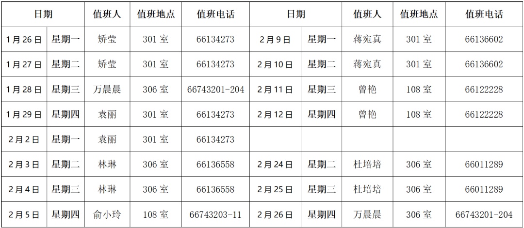 具体值班日期:1月26日-29日,2月2日-5日,2月9-12日,2月24-26日