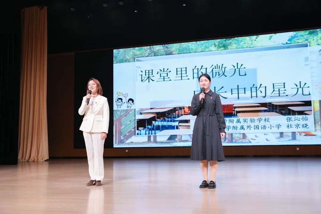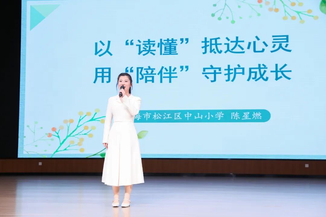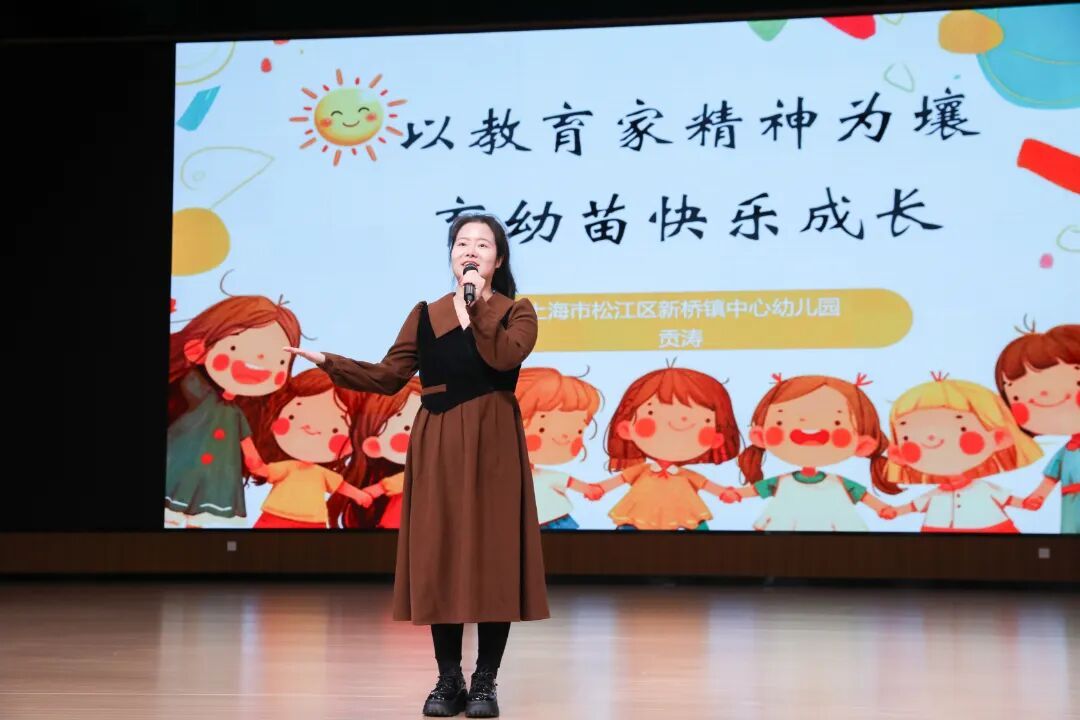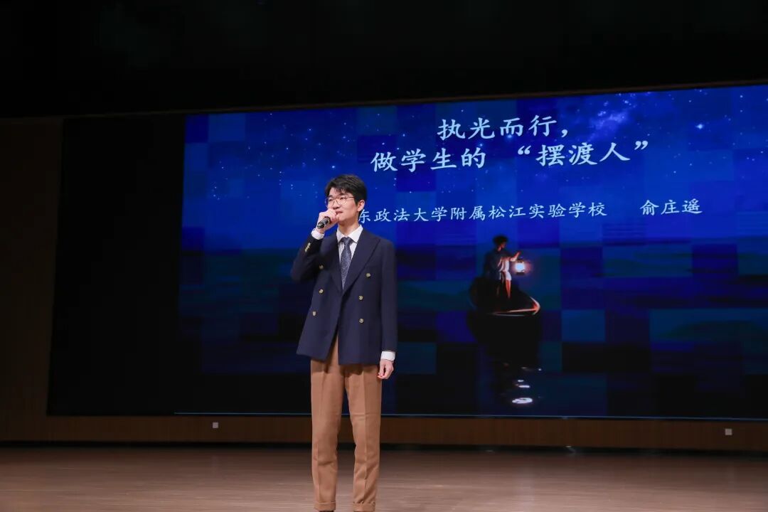 松教院附校施青青、松江七中周辰劼、新桥镇中心幼儿园贡涛、华政附校俞庄遥等作为获奖教师代表,分篇章进行了演讲展示。他们围绕课堂实践、师生对话与教育感悟,生动诠释了教育家精神在平凡教学中的生动体现。