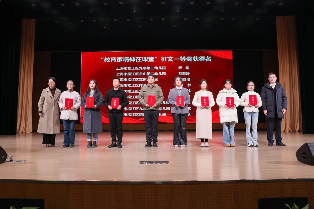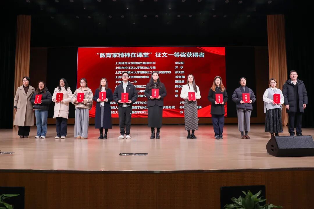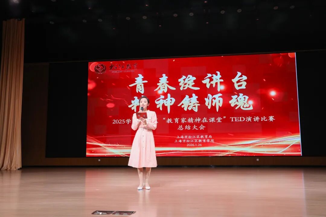 为深入弘扬教育家精神,推动青年教师专业成长,2026年1月26日下午,“青春绽讲台,精神铸师魂——2025学年松江区青年教师‘教育家精神在课堂’征文和TED演讲比赛总结大会”在华东师范大学第二附属中学松江分校举行。团区委书记吕明远,市教委人事处副处长张瑾,市教师教育学院于漪教育教学思想研究部部长陈霞,九亭镇副镇长吴青,区教育局副局长陈皇,区教育学院党委书记陈赣、副院长秦欢珍出席活动。市教师教育学院教育家精神实践基地项目相关负责人,区委宣传部相关科室负责人,松江区各学校分管师训领导、青年教师及参赛教师代表参与本次活动。 回顾两个多月的赛程,来自全区各校的155名青年教师结合自身从教经历,用一个个生动案例讲述了在课堂中践行教育家精神、传递教育温度与力量的故事。大会对2025学年“教育家精神在课堂”征文比赛及TED演讲比赛的获奖教师进行了表彰。