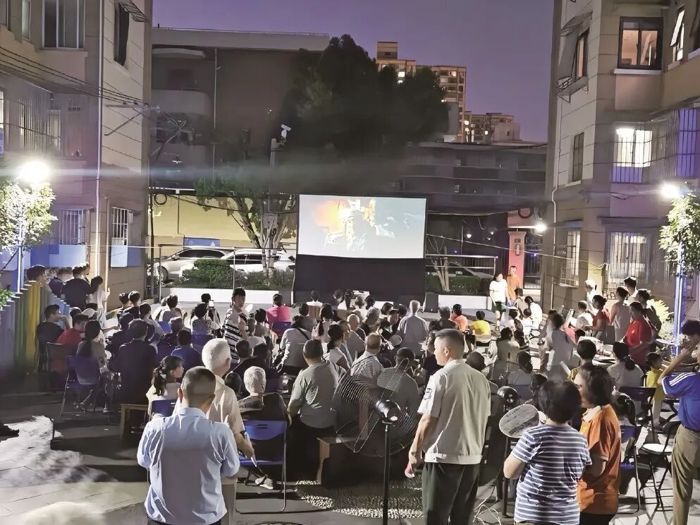东四小区物业举办居民区观影纳凉晚会,现场人头攒动。
