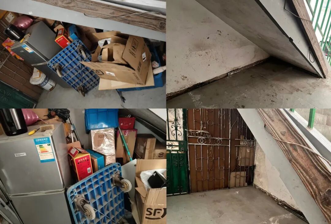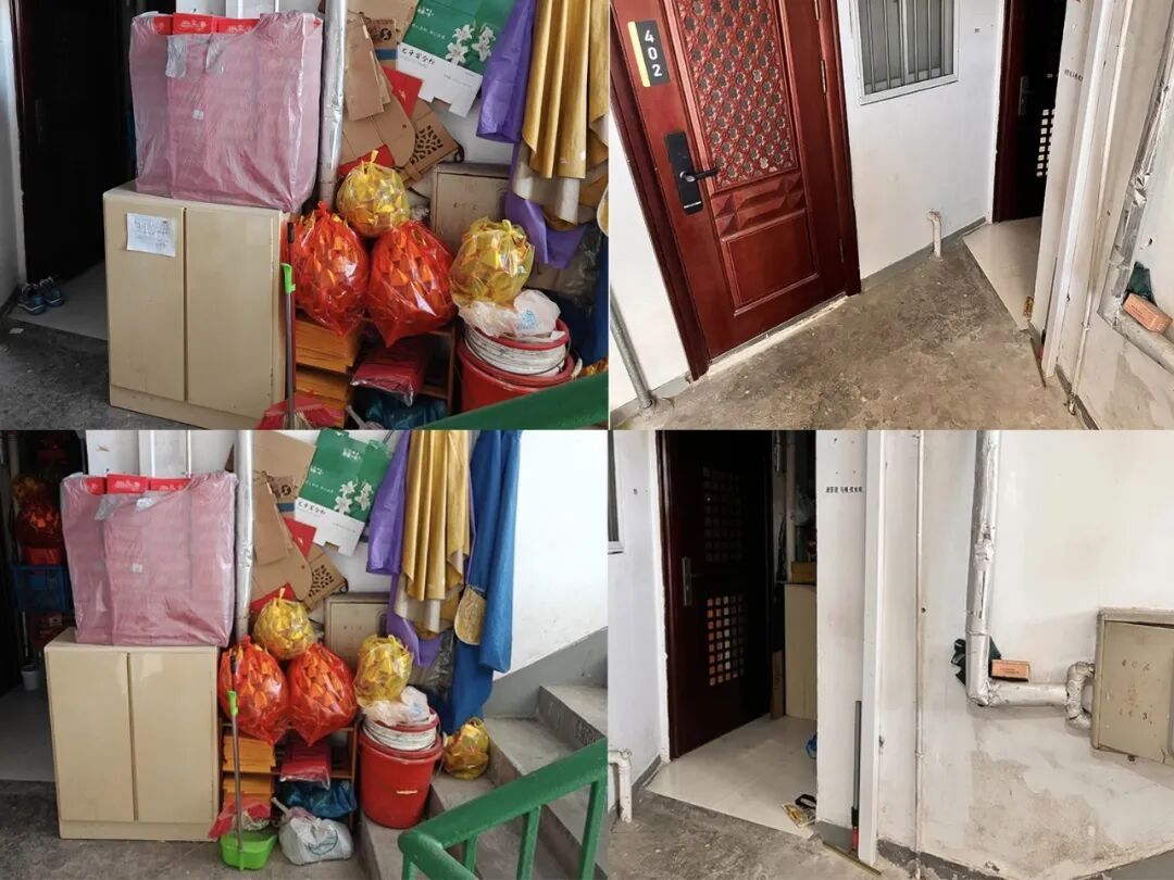 相较于楼道中的易燃隐患,另一处楼道的问题更显棘手。该住户长期将废旧家电、货物等物品堆放在一楼公共楼梯道底部,同时还将易燃易爆危险品白酒堆放在楼道内。