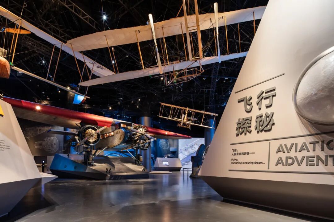 来到3楼的“飞行探秘”展区,映入眼帘的是一架“福特三发”飞机,这是上海首条民用航线通航时的主力机型,参观者可随意走进机舱参观体验。这一区域以“飞行,从梦想走向未来”为主题,展现了航空科技的发展历程和最新成就,吸引了不少中学生驻足。