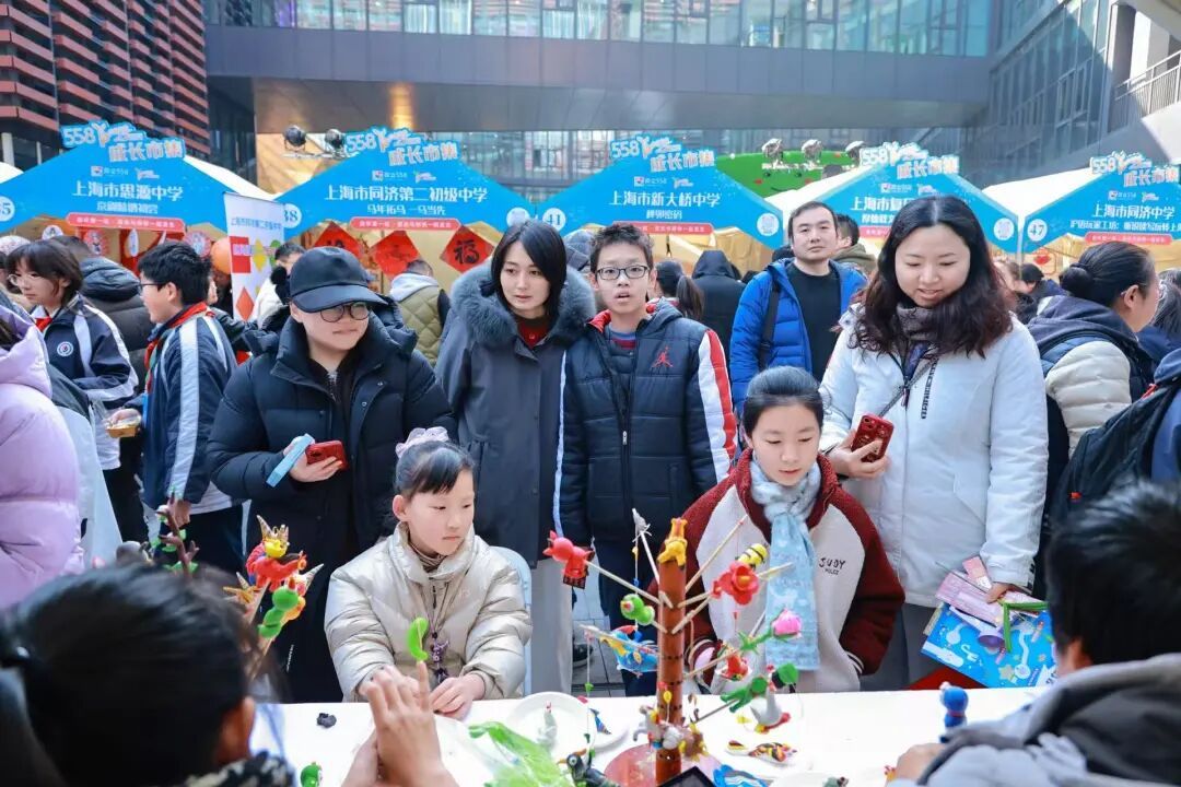 成长市集汇聚31所中小学特色展位,涵盖科技体验、艺术创作、健康科普等多个领域,通过互动游戏、手工实践等形式促进亲子协作共融。