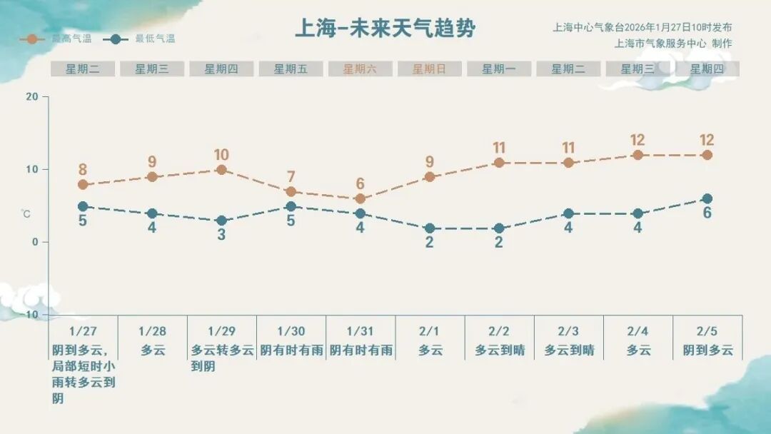 受冷空气扩散影响,申城今天(1月27日)天气以阴到多云为主,局部地区迎来短时小雨,风力略有增大,偏北风4~5级,沿江沿海地区阵风6级。今日天空云系较昨日有所减少,全天气温在5~8℃。