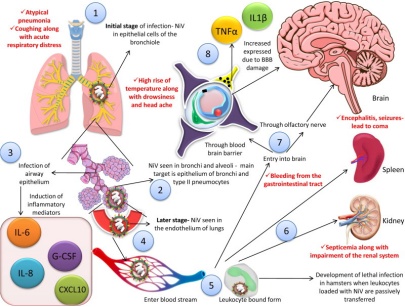 尼帕病毒可以引起人畜共患的传染病——尼帕病毒病(Nipah virus disease,NVD),该病潜伏期一般为4-14天,但有时可达45天甚至更长时间。尼帕病毒主要对中枢神经系统(90%)和呼吸系统(62%)造成损害,对肾脏,心脏和脾脏等影响较小,因此该病通常表现为发热、咳嗽、呼吸困难等急性呼吸道症状,或出现头痛、头晕、意识改变、癫痫等神经系统改变,甚至导致死亡。