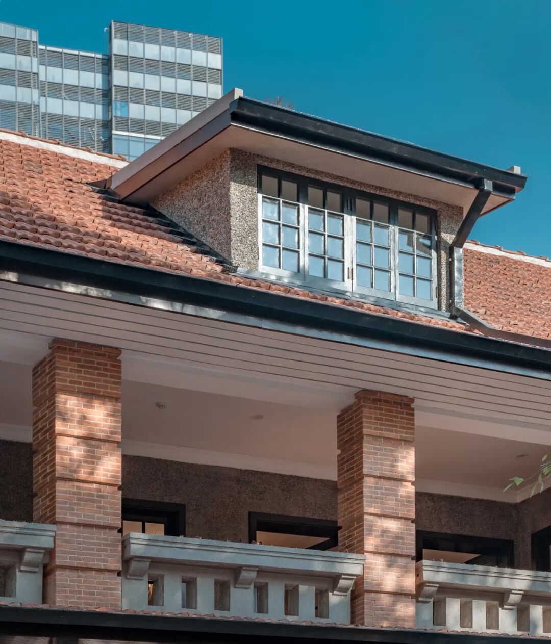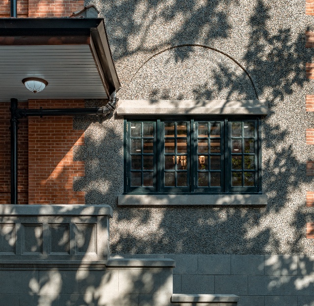 愚园路1320弄10号楼坐落于愚园路上长宁金融园内,红瓦坡屋顶错落有致,清水砖墙与卵石立面相映成趣,坡屋顶上的老虎窗线条利落,墙角铸铁水落斗上“1925”的字样清晰可辨。