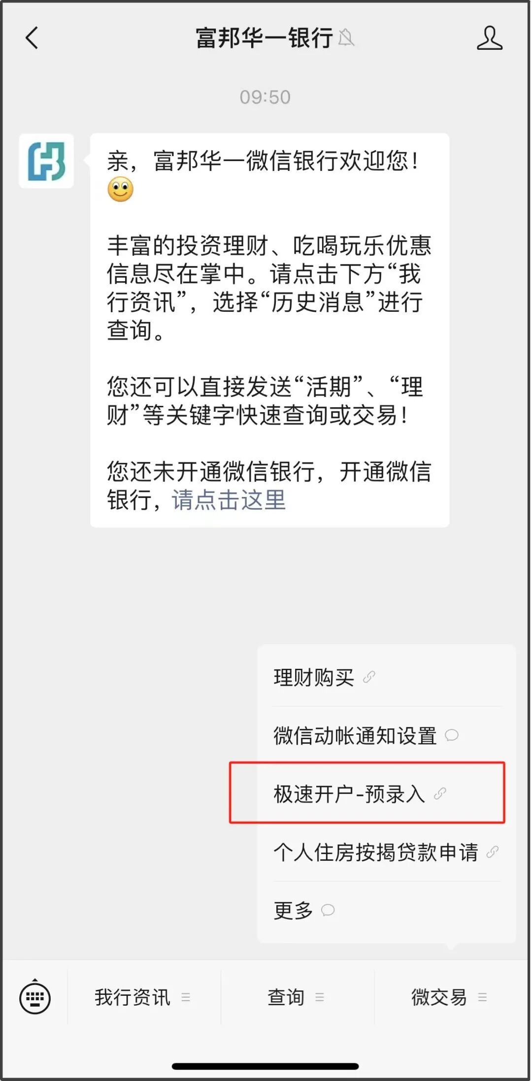 关注富邦华一银行微信公众号,点击底部菜单“微交易”——“极速开户—预录入”,即可进入预约开户界面。