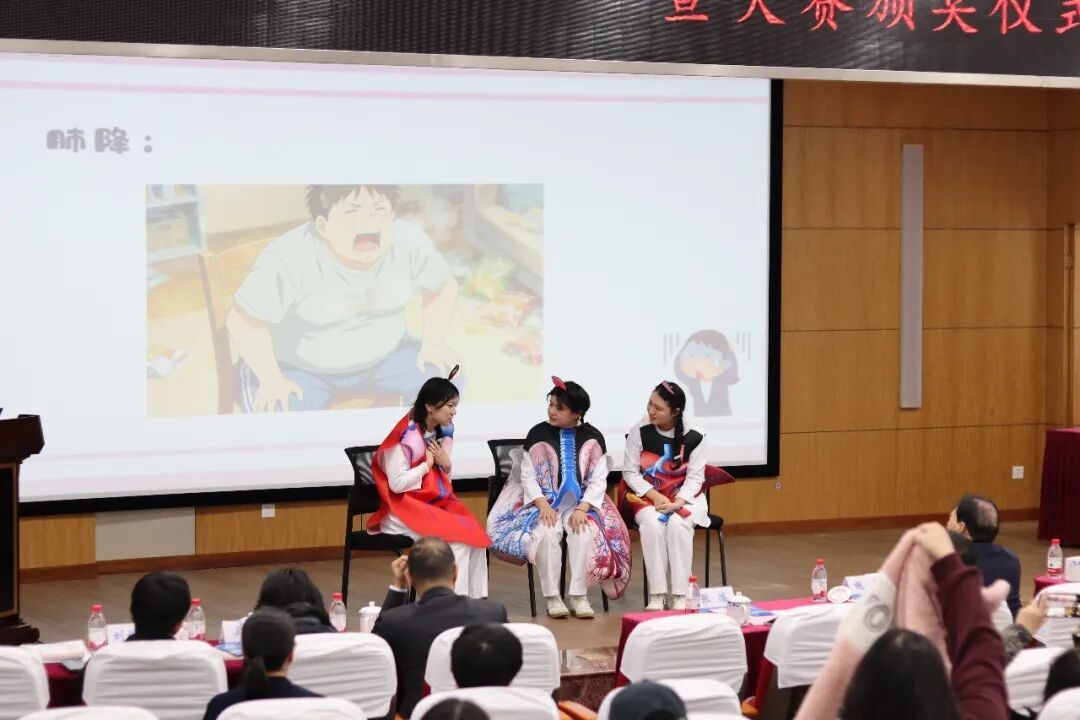 现场率先迎来专业组科普小品决赛。一小时里,6支队伍轮番登场,带来兼具知识性与趣味性的科普。首个小品来自闵行区颛桥社区卫生服务中心,以母亲用沪普劝说怀孕女儿喝鸡汤的生活化场景入手,探讨孕期体重管理;闵行区中西医结合医院的表演中,“警察”逮捕了犯下器官绑架罪和破坏罪的“肥匪”;上海市第五人民医院则上演“身体打工人”吐槽大会,各器官代表抱怨肥胖“老板”带来的负担。作品创意迭出,在欢笑中传递健康理念。