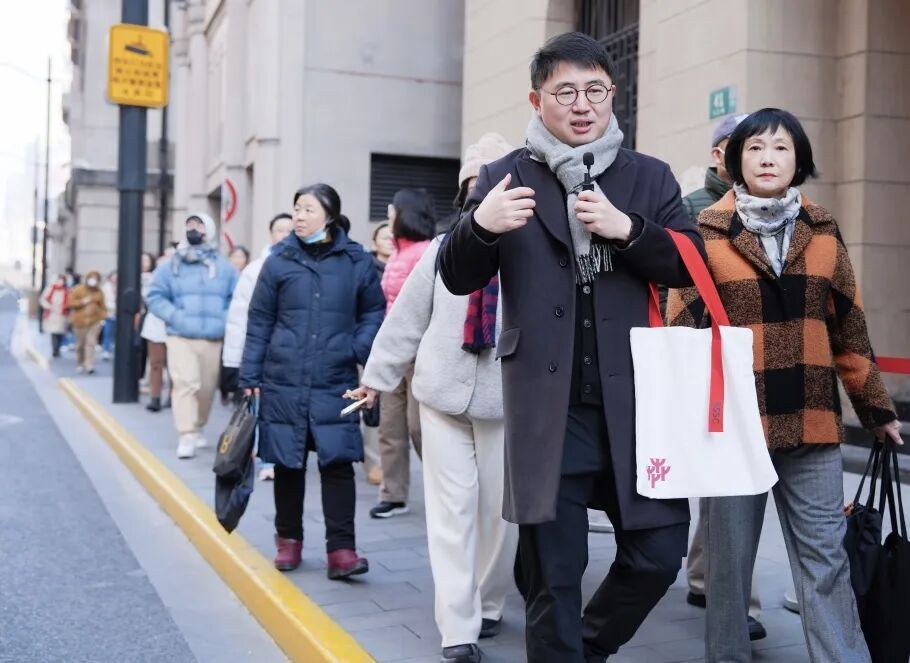 行至原工部局大楼,参与者专注聆听建筑功能变迁中的城市新生,不随意拍摄、不踏入禁行区,以庄重的注目传递对历史的尊重;行进途中,垃圾随身携带,遵守交通信号灯,更成为每个人的自觉;沿街行走时,面对狭窄的人行道与不时穿过的市民,大家默契调整步速、相互礼让,流动的队伍始终保持着舒缓而有序的节奏。这些细腻的举动,悄然汇成一道流动的文明示范风景线,让历史建筑所承载的文化记忆在安静和谐中被更好地聆听。