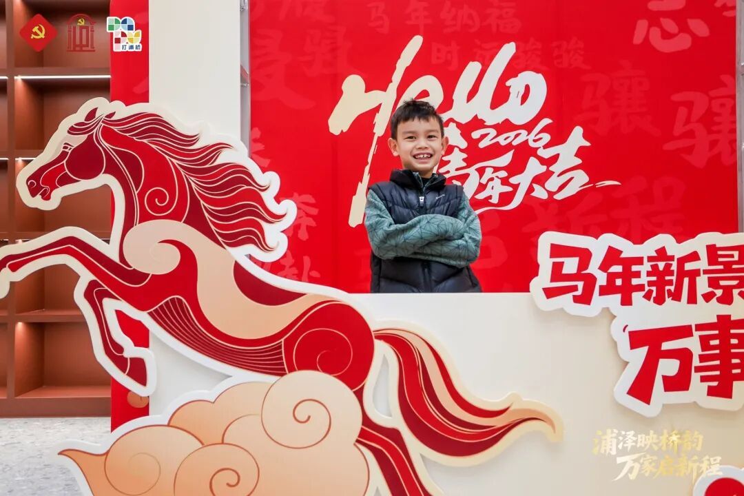 二楼的马年主题新春美陈,以红金主色调与错落的展陈设计,打造了绝佳的打卡场景。“马年大吉”“骐骥驰骋”等吉祥语搭配专属造型装置,更显精巧寓意。孩子们在“马上长大”框前踮脚比画,大人们在“一马当先”处欢笑合影,现场满是温馨喜庆,年味十足。