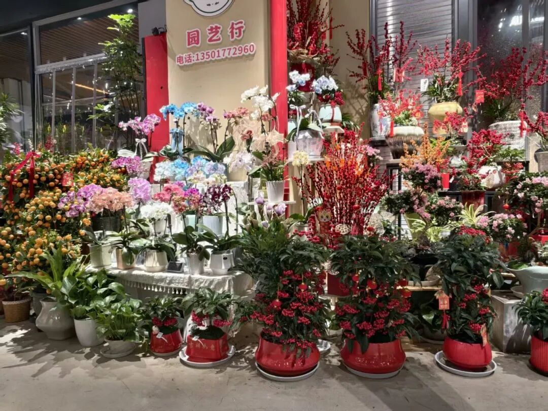 市场内暖意融融、繁花簇拥。白色、粉色、紫色的蝴蝶兰姿态清雅,挂满红果的冬青盆栽热烈喜庆,挺拔的富贵竹、清香袅袅的水仙、硕果盈枝的金桔树、造型别致的佛手等各式年宵花整齐陈列、错落有致。不少店家还为这些花卉精心搭配了装饰,红色蝴蝶结、迷你小灯笼、“平安喜乐”福卡与招财猫摆件点缀其间,更添几分吉祥意趣。