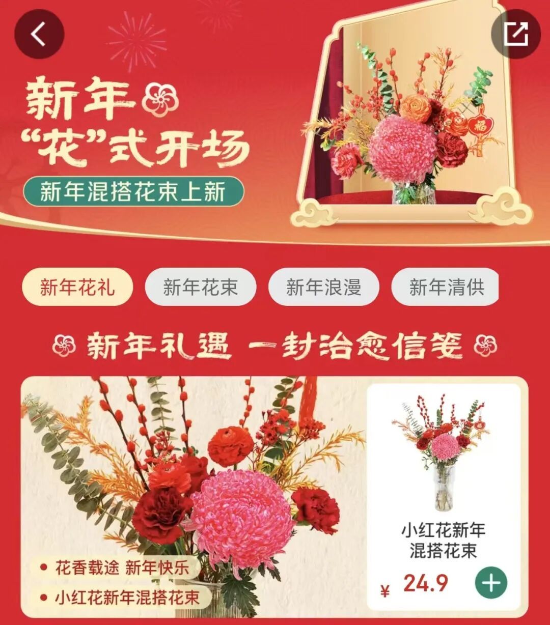 除了线下花卉市场的热闹景象,线上平台的年宵花销售也热度不减。记者随手点开七鲜超市APP,其鲜花绿植板块已上线“新年混搭花束”专属栏目,其中小红花混搭花束售价24.9元,凭借亲民价格与清新颜值性价比出众,备受消费者青睐。此外,转运竹、康乃馨、富贵竹等寓意吉祥的花卉同样人气高涨,售价不到20元,消费者只需动动手指,就能把这份“年味”一键快递到家。