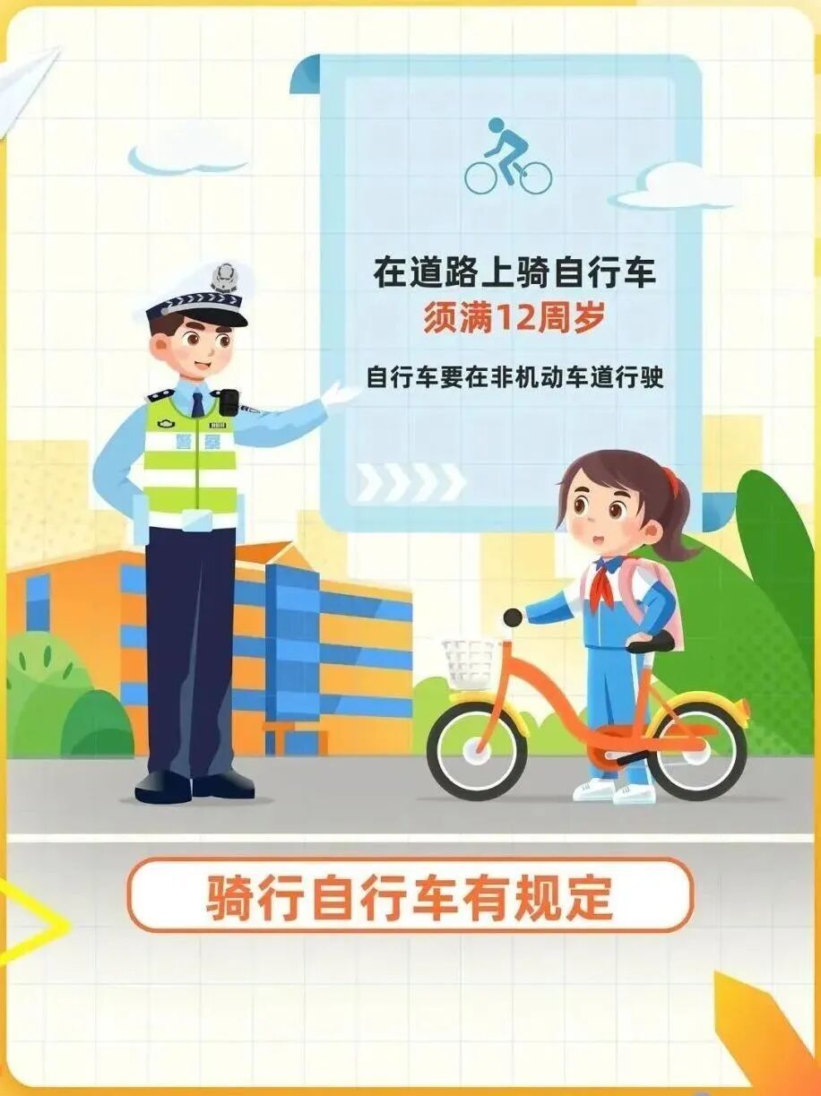 1.未满12周岁不骑自行车,未满16周岁不骑电动自行车。 2.骑行必戴头盔,不逆行、不载人、不闯灯,远离机动车道,远离大型车辆,转弯前提前观察并示意。