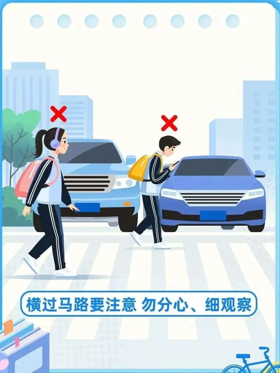 1.走人行道、靠右侧,不在马路中间嬉戏、追逐。 2.过马路走横道线,“一停二看三通过”,不翻越护栏,不闯红灯,不边行走边看手机。 3.寒假期间雨雪天气较多,路面湿滑时须放慢脚步。