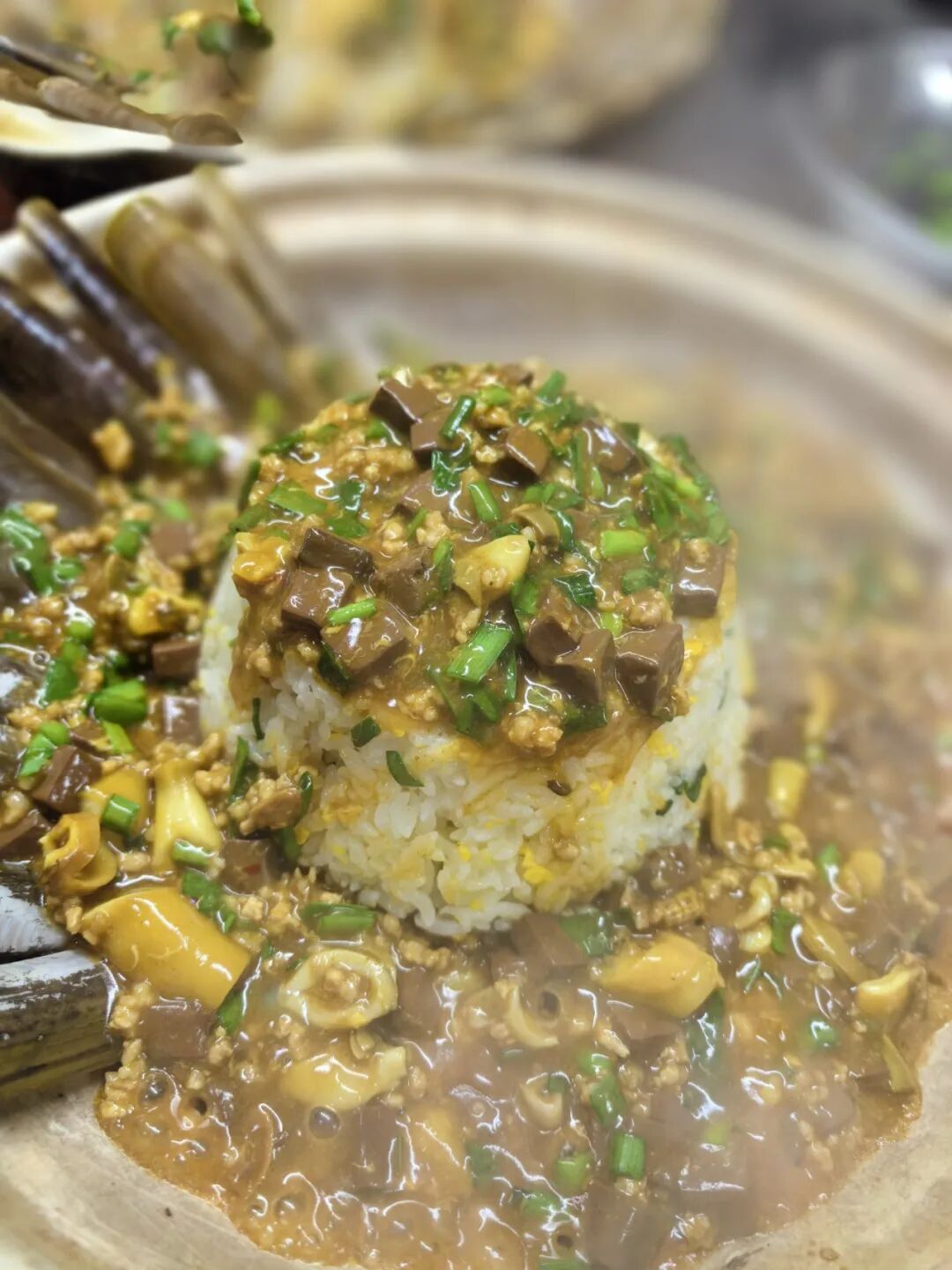 竹蛏王捞饭:选用个头硕大的竹蛏王为主料,肉质肥厚弹牙,搭配特色五常稻花香米饭与鸭血、葱花、鸡蛋等辅料,一口下去,鲜甜有料!